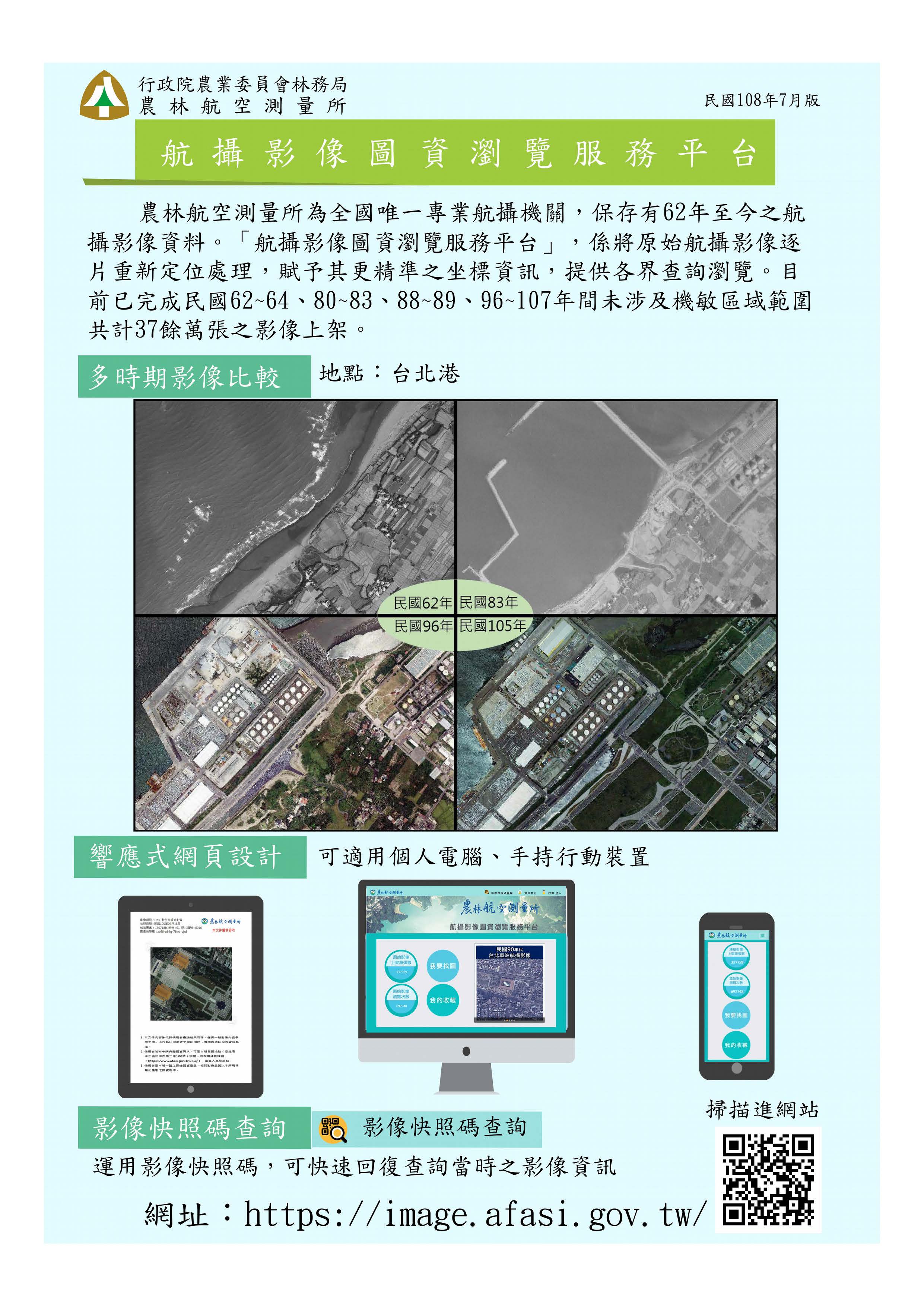 農林航空測量所為全國唯一專業航攝機關,保存有62年至今之航攝影像資料。「航攝影像圖資瀏覽服務平台」,係將原始航攝影像逐片重新定位處理,賦予其更精準之坐標資訊,提供各界查詢瀏覽。目前已完成民國62~64、80~83、88~89、96~107年間未涉及機敏區域範圍共計37萬餘張影像上架,歡迎各界多加使用。