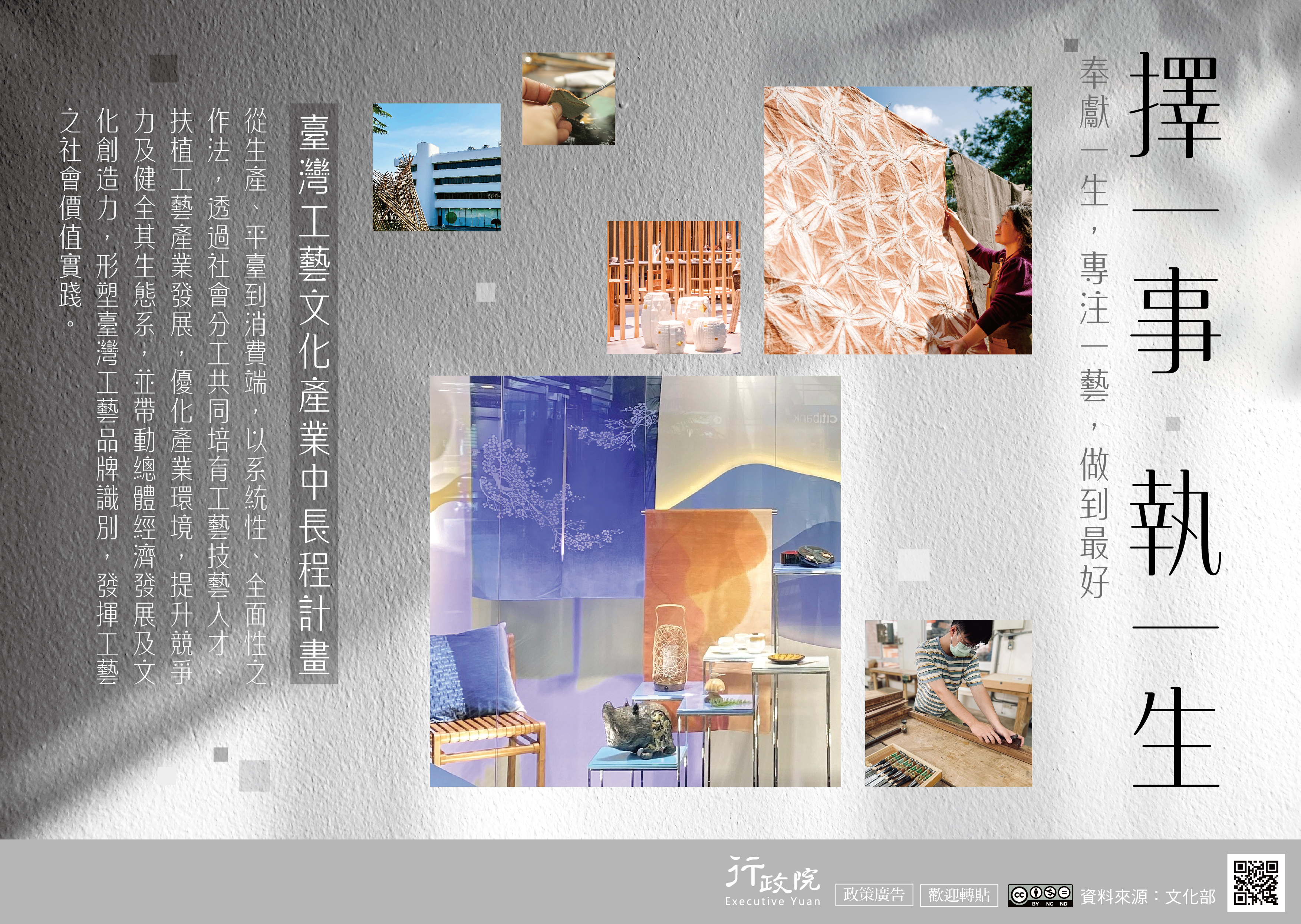 為扶植臺灣工藝文化產業發展,政府推動「臺灣工藝文化產業中長程計畫」,從生產、平臺到消費端,透過社會分工培育人才,以跨業、跨域及跨部門合作,健全工藝產業生態系,帶動總體經濟發展及文化創造力,形塑臺灣工藝品牌識別,並發揮工藝之社會價值。