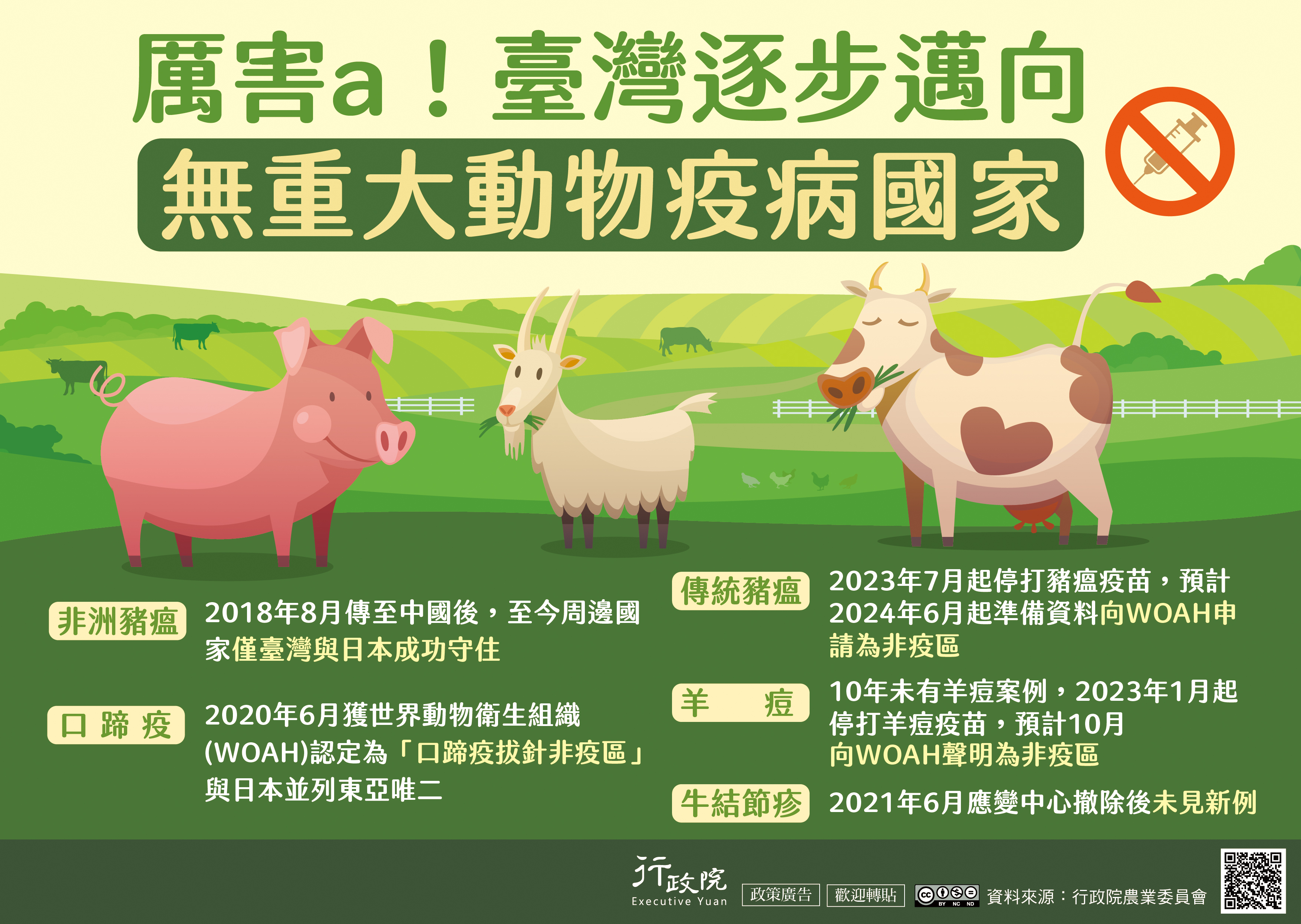近年我國在動物疫病防疫有成,成功守住非洲豬瘟和撲滅口蹄疫疫情,預計明(2024)年向「世界動物衛生組織」(WOAH)申請「豬瘟非疫區」,逐步邁向無重大動物疫病國家。