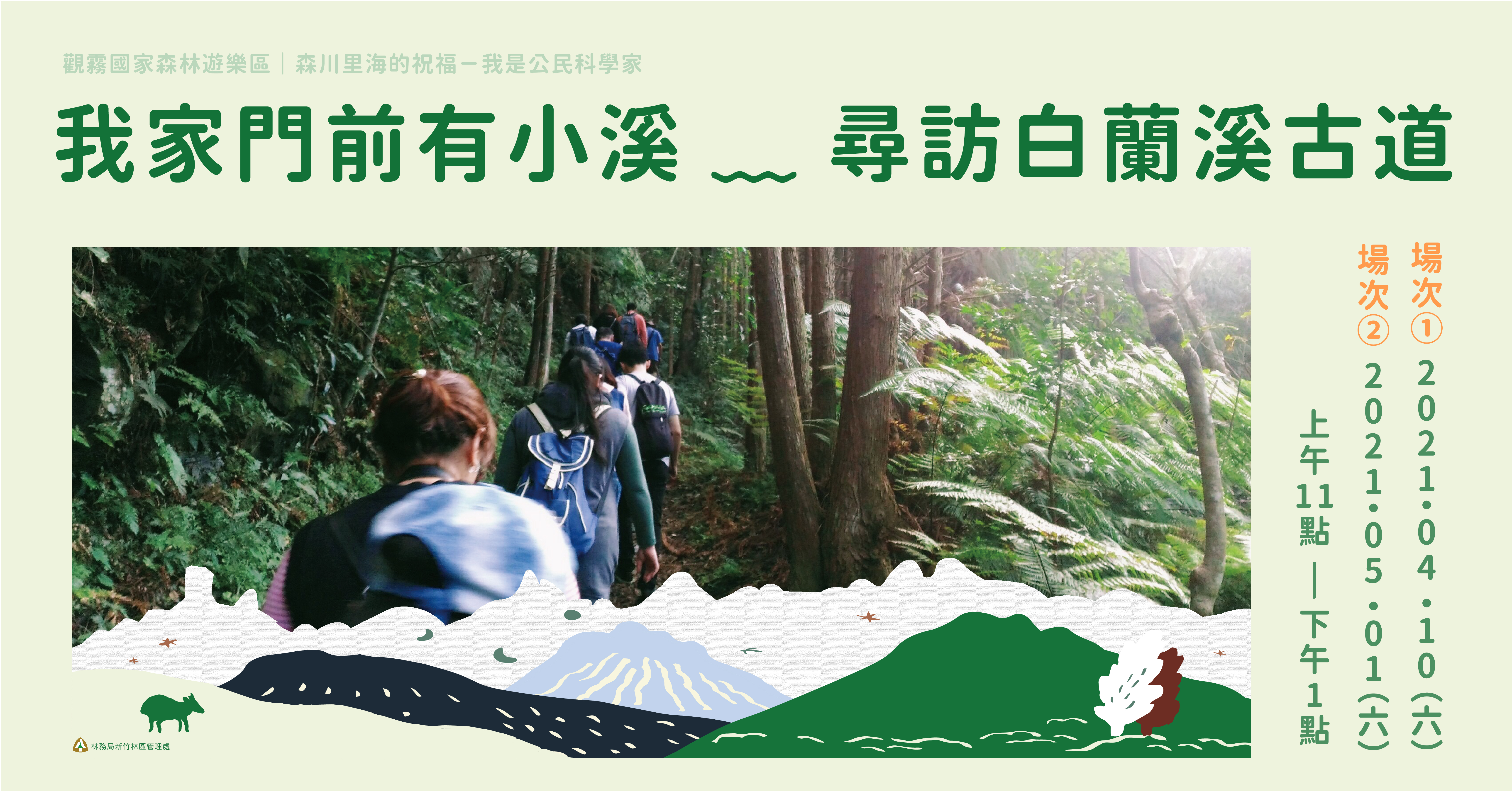 觀霧國家森林遊樂區及其周邊地區為泰雅族傳統生活範圍,為使遊客認識觀霧地區泰雅族與山林間的人文歷史與過往風情,林務局新竹林區管理處將於今(110)年4月10日(六)及5月1日(六)上午11點至下午1點,在新竹縣五峰鄉白蘭部落舉辦2場次「我家門前有小溪─尋訪白蘭溪古道」戶外導覽觀察活動。每場活動各限額40名(共計80名),採網路事先報名,報名費每人新臺幣350元,並將於2月22日(一)晚上8點起開放報名。想要了解原住民族人文歷史與豐富文化的民眾及觀霧忠實粉絲們,請千萬不要錯過。 觀霧國家森林遊樂區位於新竹縣五峰鄉及苗栗縣泰安鄉交界,園區及周邊地區是周邊泰雅族傳統生活範圍,族人長期居住於此,順應自然環境生活,培養出與山林共存共榮的生活哲學與智慧。為讓民眾感受觀霧地區的原住民文化,認識泰雅族與山林間的人文歷史與過往風情,本次活動邀請新竹縣五峰鄉白蘭部落耆老曾嘉慶mama,帶領大家漫步白蘭溪古道,聆聽耆老述說泰雅族故事、了解狩獵文化、山林禁忌、泰雅族與溪水之間的連結與辨識山林可食用野菜等,並享用獵人風味便當,體驗有別於繁忙都市生活的幽靜時光。 本次2場活動是觀霧國家森林遊樂區今(110)年規劃舉辦12場「森川里海的祝福─我是公民科學家」系列主題活動之一,接下來還有9場精選主題活動,參加活動即有機會獲得觀霧國家森林遊樂區專屬精美好禮,有興趣參與的朋友要把握報名機會。 如欲報名或了解本次活動,可利用以下連結(4/10場次報名連結為https://www.accupass.com/go/2021-02-Guanwu 、5/1場次報名連結為https://www.accupass.com/go/2021-03-Guanwu ),亦請於上班時間(週一至週五 8:30 ~ 17:30)電洽 03-363-2488 圈谷彭小姐諮詢。更多活動資訊可密切注意台灣山林悠遊網(https://recreation.forest.gov.tw/)及「觀霧國家森林遊樂區」臉書粉絲專頁(https://www.facebook.com/GuanwuNationalForest/)。