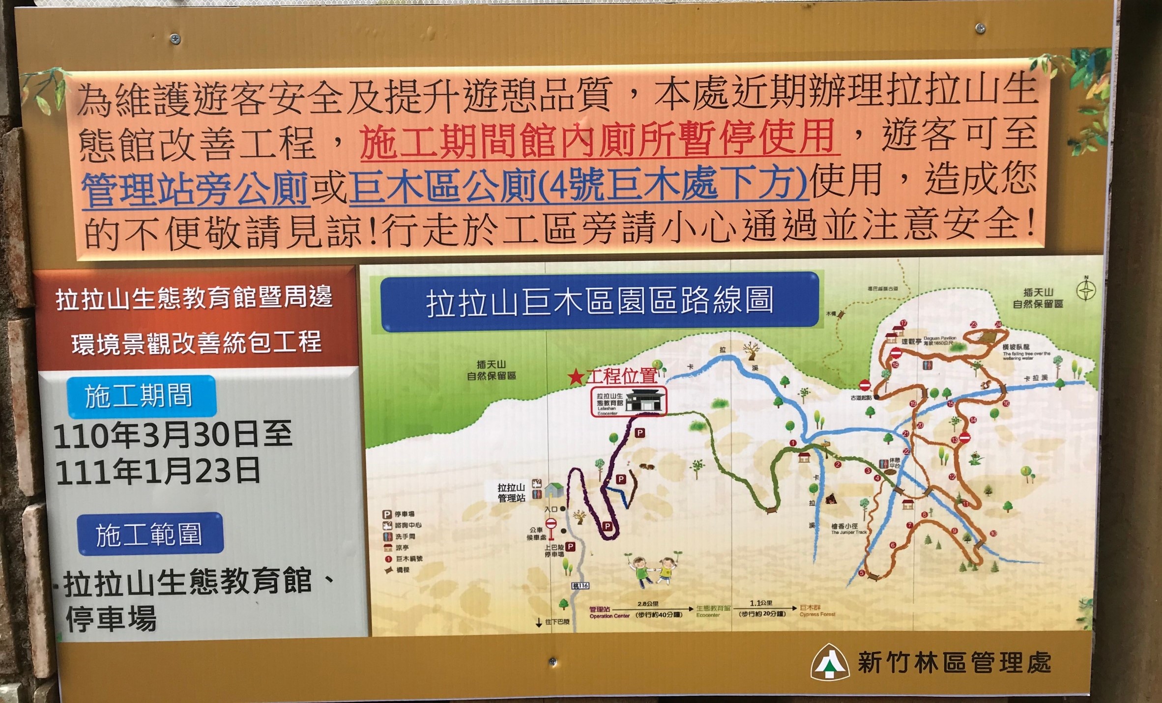 因應拉拉山國家森林遊樂區的成立,為提供民眾更優質軟硬體服務,園區內近期已啟動生態教育館轉型為遊客中心的改善工程,接續亦將有管理站及箱涵等改善工程陸續展開,工期預計至111年1月底。 林務局新竹林區管理處請民眾體諒施工期間造成的不便,提醒上山民眾經過施工區域時,特別注意安全外,因原有館舍進行室內施工,基於安全考量已封閉,提醒入園民眾有如廁需求,可以先至上巴陵停車場旁的公共廁所,或園區入口管理站旁公共廁所,以節省排隊等候時間。另於停車場設有臨時廁所,步道內之4號巨木旁公廁仍持續提供服務。 林務局新竹林區管理處所轄位處桃園市復興區的拉拉山巨木區,一直是民眾親近大自然與巨木近距離接觸的熱門場域。區內擁有原始檜木林等豐富生態價值的森林環境,具有特殊之森林、野生物、氣象等景觀,富有環境教育發展潛力,符合「森林遊樂區設置管理辦法」第3條設置國家森林遊樂區之實質條件,也是第一個應部落居民企望與支持,由下而上發起要推動成立的國家森林遊樂區,新竹林區管理處已盤點園區資源及基礎設施,積極朝劃設為拉拉山國家森林遊樂區工作前進。拉拉山國家森林遊樂區綱要規劃書已於110年3月16日獲行政院農業委員會核定;後續也正整備環境影響評估書件送審,另也進行部落導覽員的培訓計畫,期盼在地人說在地故事,能讓民眾在親山近山的休憩活動中,更瞭解在地泰雅原民文化。