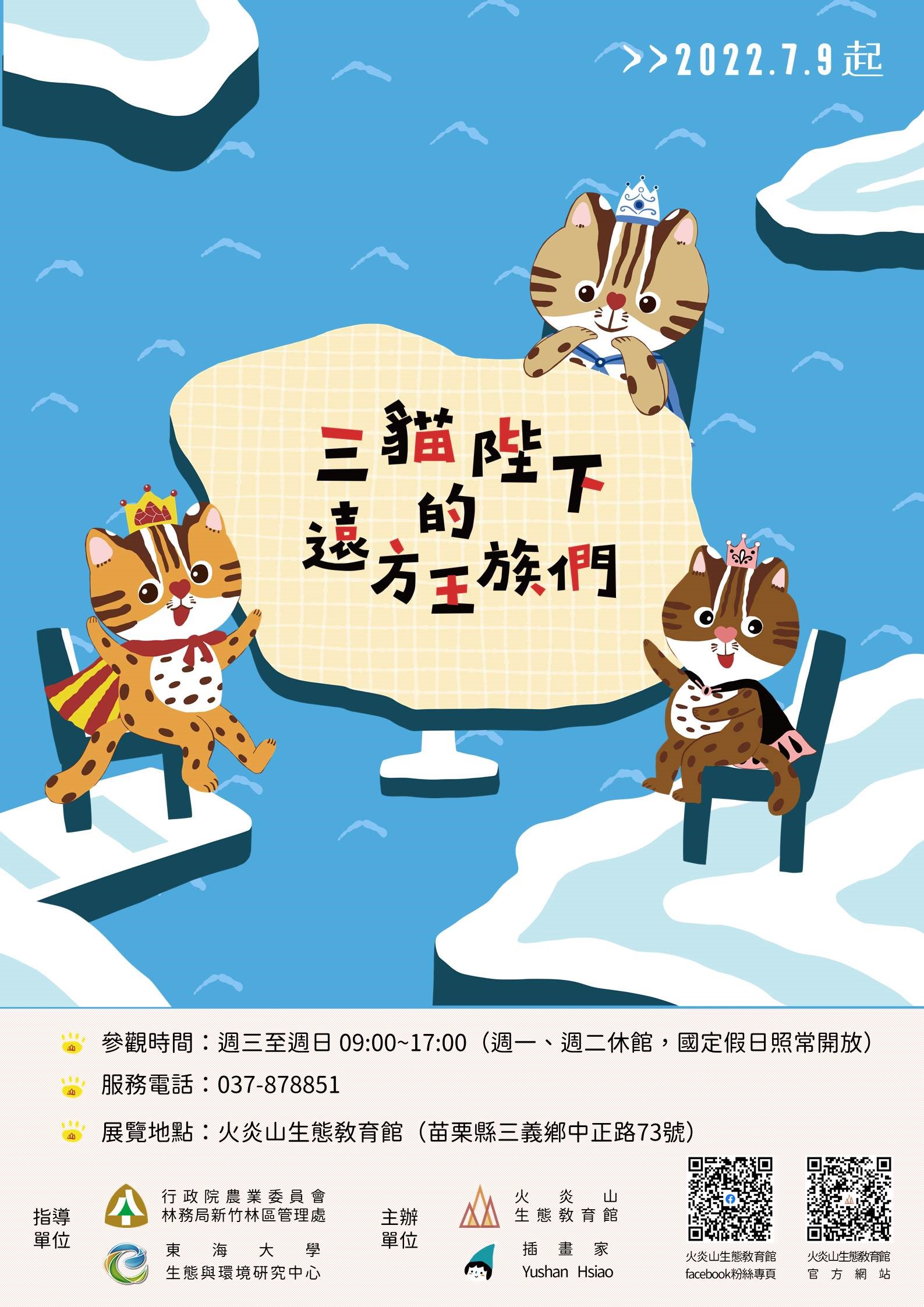 新竹林區管理處訂於111年7月9日(六)上午9時30分在火炎山生態教育館舉辦「三貓陛下的遠方王族們」特展暨「話畫三義」公益畫展開幕儀式,歡迎大、小朋友跟著火炎山石虎王國的國王「三貓陛下」一起在三義遇見石虎,了解石虎的大小事,認識石虎的遠方親戚,透過不同國家的石虎保育行動,重新省思大家忽視的視角,思考對於野生動物還能做出那些友善的行動,另現場還有摸彩抽獎活動,將抽出當日的幸運保育王! 位於苗栗最南端的火炎山,保留完整的惡地地景與淺山森林,提供三義淺山動物棲息的所在,這裡具有豐富的自然生態資源,包含瀕臨絕種的明星物種-石虎。石虎雖然是臺灣的原生貓科動物,卻不是臺灣特有的物種,牠屬於亞洲豹貓的其中一支亞種,亞洲豹貓是一種廣泛分佈於亞洲的小型貓科動物,鄰近國家以日本為例,就有西表山貓、對馬山貓等與臺灣石虎親緣相似的物種,本次展覽將探討不同環境中亞洲豹貓的習性與特徵及生存上遇到的危機。 同時,三義有一群開朗的油畫班學員,在畫作上投注自己對於三義這塊土地的熱情,繪製了許多幅關於三義、關於石虎的畫作,而這群熱情的哥哥姐姐們藉由繪製石虎畫作的歷程,串聯起三義在地鄉親與石虎保育間的連結。 7月9日(六)在火炎山生態教育館,除了跟著三貓陛下一起走進石虎王國認識石虎家族外,還有「苗栗縣三義鄉樂齡學習中心~幸福學院」的石虎畫作,等著大家一同鑑賞。當日開幕活動採自由參與,其中活動有摸彩、拍照打卡等活動可換取特展限定小物,邀您和家人朋友來度過不一樣的周末! 更多資訊請至「火炎山生態教育館」FB粉絲專頁(https://www.facebook.com/HuoyanshanEcocenter)或官方網站(http://hoyenshan.org/)查詢,亦可洽火炎山生態教育館(037)878-851李小姐。 【展館資訊】 名稱:火炎山生態教育館 開館時間:週三~週日 09:00~17:00 (週一/週二 休館) 地址:苗栗縣三義鄉中正路 73 號 電話:037-878851