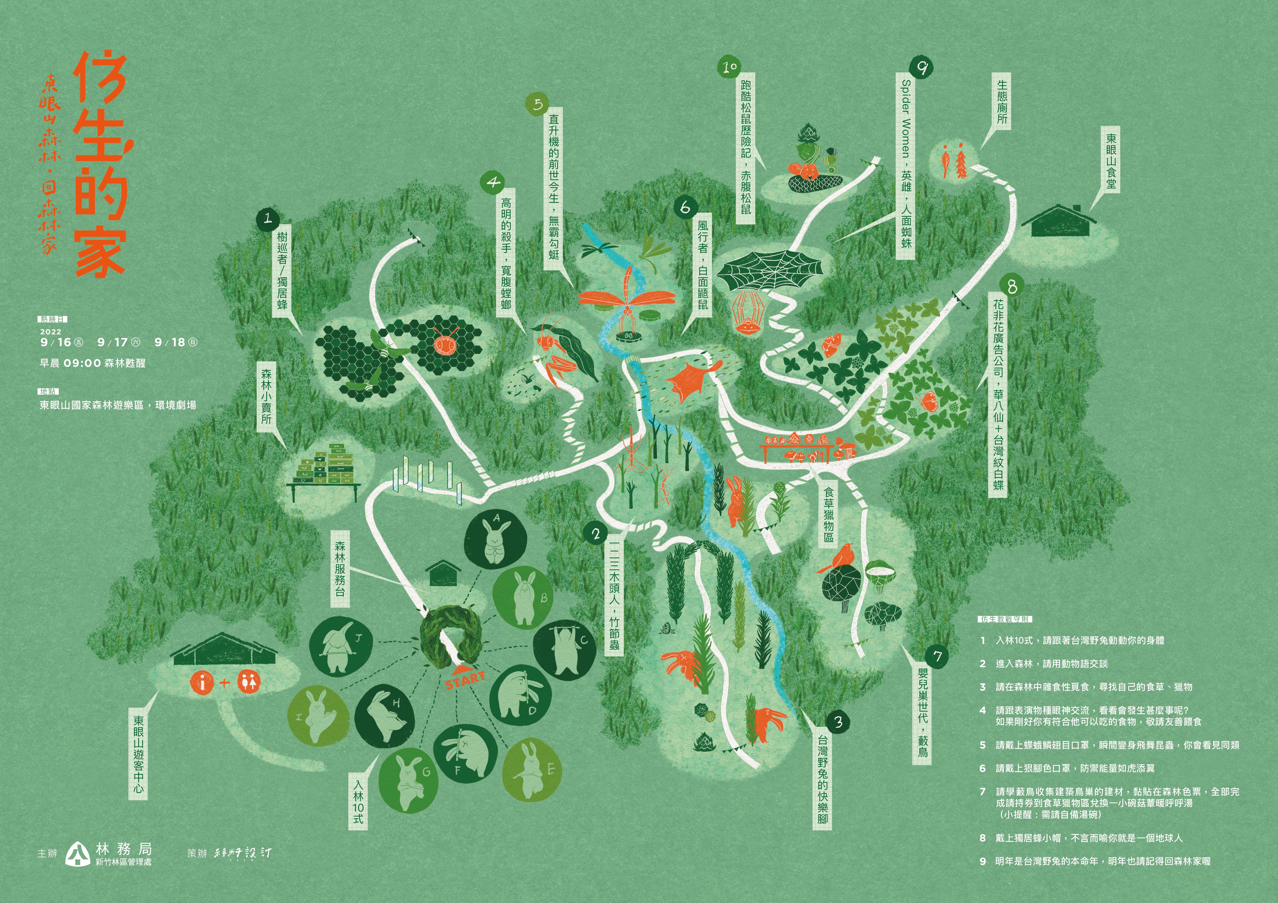 還記得上次在東眼山「回森林家」溫暖及細膩情感洋溢心中的感受嗎?經過一年多的蜇伏,你我記憶中的那個家,這次變身為森林劇場回來了,新竹林區管理處東眼山國家森林遊樂區9月16-18日歡迎大家到東眼山一起學習森林的語言,和森林對話,不論是和竹節蟲玩一二三木頭人,或是深入人面蜘蛛的地盤,還是和台灣野兔來場快腳比賽,都將展現給你森林內多元的物種生態面貌與融入仿生的環境藝術創作。 新竹林管處表示,今年東眼山回森林家以「仿生」為策辦核心,有別於以往森林間市集的聚會,這次邀請台灣第一位進入太陽馬戲團的張逸軍老師將東眼山打造成第一座森林大劇場,邀請每位遊客進入森林劇場前跟著老師學習「入林十式」,運用森林語言和藏身在東眼山柳杉林中10處由表演者化身的動物、昆蟲等森林精靈們互動,另外,由動物或昆蟲發想的食物設計,不論是台灣野兔入林十式餅乾、菇蕈暖呼呼湯等,都可以讓遊客與仿生精靈間有更進一步的溝通。 這三天在自然的森林環形劇場裡,可以遇到各種仿生精靈盡情展現牠們在大自然的姿態及律動,有竹節蟲、寬腹螳螂、無霸勾蜓、白面鼯鼠、赤腹松鼠、人面蜘蛛、台灣野兔、藪鳥、台灣紋白蝶及華八仙,在山林間與你不期而遇,下午所有仿生精靈匯集在溪谷進行高空大表演,最後再隨著精靈們走出森林,由森林回歸到都市,由森林語言回復到人的語言。 除化身為森林的精靈外,今年的回森林家更推出仿生造型口罩可以戴上和林間的仿生者互動,而兒童T恤、入林十式台灣野兔版毛巾及刺繡丹寧帽等活動限定商品,也將於活動期間特價9折限定銷售,歡迎遊客來森林間的小賣所支持選購。記得自帶環保碗,在完成限定活動後可以進行兌換每日限量神秘菇蕈湯一碗唷! 歡迎搭乘大眾運輸桃園客運台灣好行506(東眼山線)從桃園大溪總站回東眼山,平日有3班,假日有6班,或是搭乘幸福巴士F906(三民經蝙蝠洞-東眼山),共同守護地球。 更多活動資訊同步放送「東眼山.回森林家」官方網站(https://www.facebook.com/2019ReturnToTheForest/)