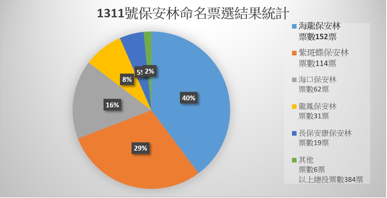林務局新竹林管處所轄,位於竹南鎮海岸線從龍鳳漁港南側起至中港溪北邊的海口里,有一道長近4公里、面積約107公頃的海岸森林,早於民國前3年即已編入為1311號飛砂防止保安林,新竹林管處為拉近民眾與保安林的距離,宣導保安林對國土保安功能的重要性,以民眾票選的方式重新命名,由「海龍保安林」出線獲得最高票。 本次命名活動收集了各年齡層的在地居民、外地遊憩民眾對於編號1311保安林新名字看法,採多元的票選方式進行,針對該號保安林的環境地理、與在地人文關係的串連,新竹林管處與海口社區發展協會人員集思廣益,發想出五個具意義又具代表性的候選名字,分別在海口社區發展協會辦理環境教育活動、海口里在地居民參與社區關懷集會及新竹處在該號保安林內辦理小花蔓澤蘭除蔓活動時,一併請參與民眾票選。另為吸引年輕網路族群參與,同步於海口社區發展協會粉絲專頁進行線上票選活動,一共吸引了384位民眾參加,票選結果,以保安林位於「海」口里及「龍」鳳漁港之間,取其組合名字「海龍保安林」獲得152票最高票,其次為「紫斑蝶保安林」114票,新竹林管處也依票選結果,將編號1311號保安林命名為「海龍保安林」。海口社區發展協會陳總幹事表示,在地居民透過環境教育及參與命名的過程,更加理解保安林對環境公益,對在地居民生活的意義及價值,能選出貼近在地的保安林名稱,大家都非常開心,也將持續協力海龍保安林的環境清潔與海岸淨灘工作。 新竹林管處表示,飛砂防止保安林多位於沿海或河口兩岸風砂強大地區,擔負阻絕或過濾強風所帶來的飛砂,避免農田、房舍等設施遭到砂礫掩埋,海龍保安林自民國前3年編入起到現在已有超過一百年的時間,像一條綠色巨龍,提供海岸保護、飛砂抑止功能,默默保護竹南鎮中港、營盤邊、海口地區農田、房舍、道路外,蒼鬱完整之防風林帶,有遠近馳名的「親子之森」、「假日之森」、「長青之森」等戶外踏青景點,林間並有「三森步道」連接,每逢假日吸引民眾前來散步、騎腳踏車,提供優質的戶外遊憩場域。 本區海岸林帶也是生物生育棲息的基地,每年4至5月有大量紫斑蝶從高雄市茂林山區出發飛往北部繁殖,海龍保安林是國內目前已知斯氏紫斑蝶最大繁殖地,新竹林管處與民間團體合作,在保安林內種下近千棵蜜源植物,營造紫斑蝶友善棲地環境,也希望透過保安林命名活動,凝聚民眾認知保安林的公益功能與生態價值。
