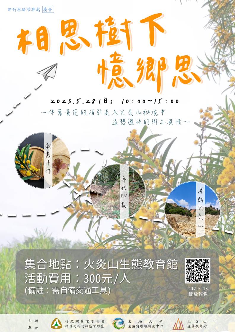 林務局新竹林區管理處火炎山生態教育館將於5月28日(日)舉辦「相思樹下憶鄉思」主題活動,每年一到春風吹起的時節,火炎山中的林木開始綻放出多樣的色彩,伴隨著山腳下點點黃花,原來那就是腦海中相思的記憶,本次活動延續111年火炎山森林系列課程,再次讓大家透過課程觀察相思樹的內裡外在,並認識相思樹產業的變遷,活動於5月13日(六)中午12點開放線上報名(報名連結:https://reurl.cc/20Yo6E),名額限定25位,請把握機會報名,額滿為止。 火炎山地質脆弱常因環境營力風化侵蝕,使本區植物多為適應崩塌地之向陽先驅樹種,如臺灣二葉松、相思樹等,其中相思樹因抗旱耐風及水土保持的效果,成為火炎山保安林中不可或缺的造林樹種。而相思樹也是臺灣早期重要的經濟樹種之一,因其樹材質地堅硬、耐濕等優點,過往常作為農具、鐵軌枕木、薪炭材等用途,相思木炭產業在苗栗尤為盛行,漫步火炎山周邊古道仍能發現殘留的炭窯遺跡。 火炎山生態教育館將於5月28日再次舉辦主題活動「相思樹下憶鄉思」,帶領大家一探相思樹產業的變遷,親手製作創意相思樹杯墊。另外依文化資產保存法規定,進入火炎山自然保留區應依「申請進入自然保留區許可辦法」第2條規定進行申請,本活動將採統一申請進入火炎山自然保留區實地觀察,深度認識相思樹的表裏,更多活動訊息同步發送火炎山生態教育館粉絲專頁或歡迎直接來電洽詢。 Facebook 官方粉絲專頁: https://www.facebook.com/HuoyanshanEcocenter 官方網站:http://hoyenshan.org/ Beclass 線上報名:https://reurl.cc/20Yo6E 【展館資訊】 名稱:火炎山生態教育館 開館時間:週三~週日 09:00~17:00 (週一/週二 休館) 地址:苗栗縣三義鄉中正路 73 號 電話:037-878851