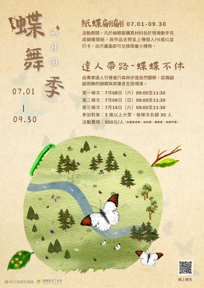 炎炎夏日,擁有「北部蝴蝶谷」美名的滿月圓進入了賞蝶佳期,園區步道上的蝴蝶生態精采可期,新竹林區管理處特別舉辦【達人帶路-蝶蝶不休】主題活動,邀請您來趟滿月圓賞蝶之旅,在專業老師的引導下與蝴蝶近距離接觸,用雙眼觀察與認識蝴蝶繽紛的舞姿及生態環境,再透過遊客中心【紙蝶翩翩】DIY活動,將屬於自己獨一無二的蝴蝶帶回家珍藏。 【達人帶路-蝶蝶不休】活動辦理日期為7月8日(六)、7月9日(日)、7月15日(六)共計三梯次,由達人引導進行森林步道自然觀察,認識翩翩飛舞的蝴蝶與其生態環境。每梯次30位名額,(採線上預約方式)活動費用500元/人,5月31日(三)上午10點起開始受理,額滿為止。 另外,遊客中心自 7月1日起至9月30日辦理現場活動【紙蝶翩翩】,在步道上欣賞完美麗的蝴蝶後,至遊客中心蝴蝶館購買【紙蝶翩翩】材料包,於現場完成指定任務,即可兌換滿月圓專屬蝴蝶徽章禮品乙份,每日禮品有限,發完為止。 滿月圓國家森林遊樂區誠摯地邀請您一同走進滿月圓的步道當中探索、近距離的觀察,體驗自然美景。相關訊息可追蹤「滿月圓國家森林遊樂區」臉書粉絲專頁或上「臺灣山林悠遊網」查詢,亦可洽詢滿月圓國家森林遊樂區遊客中心電話02-26720542(08:30-17:00,週二休館)。