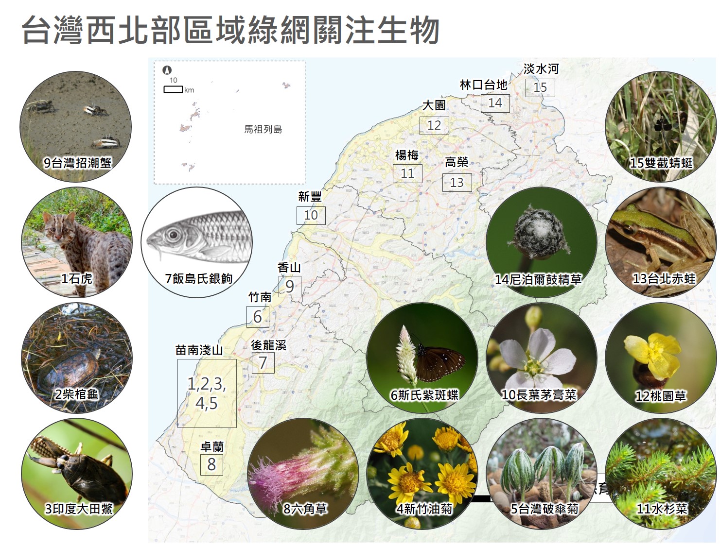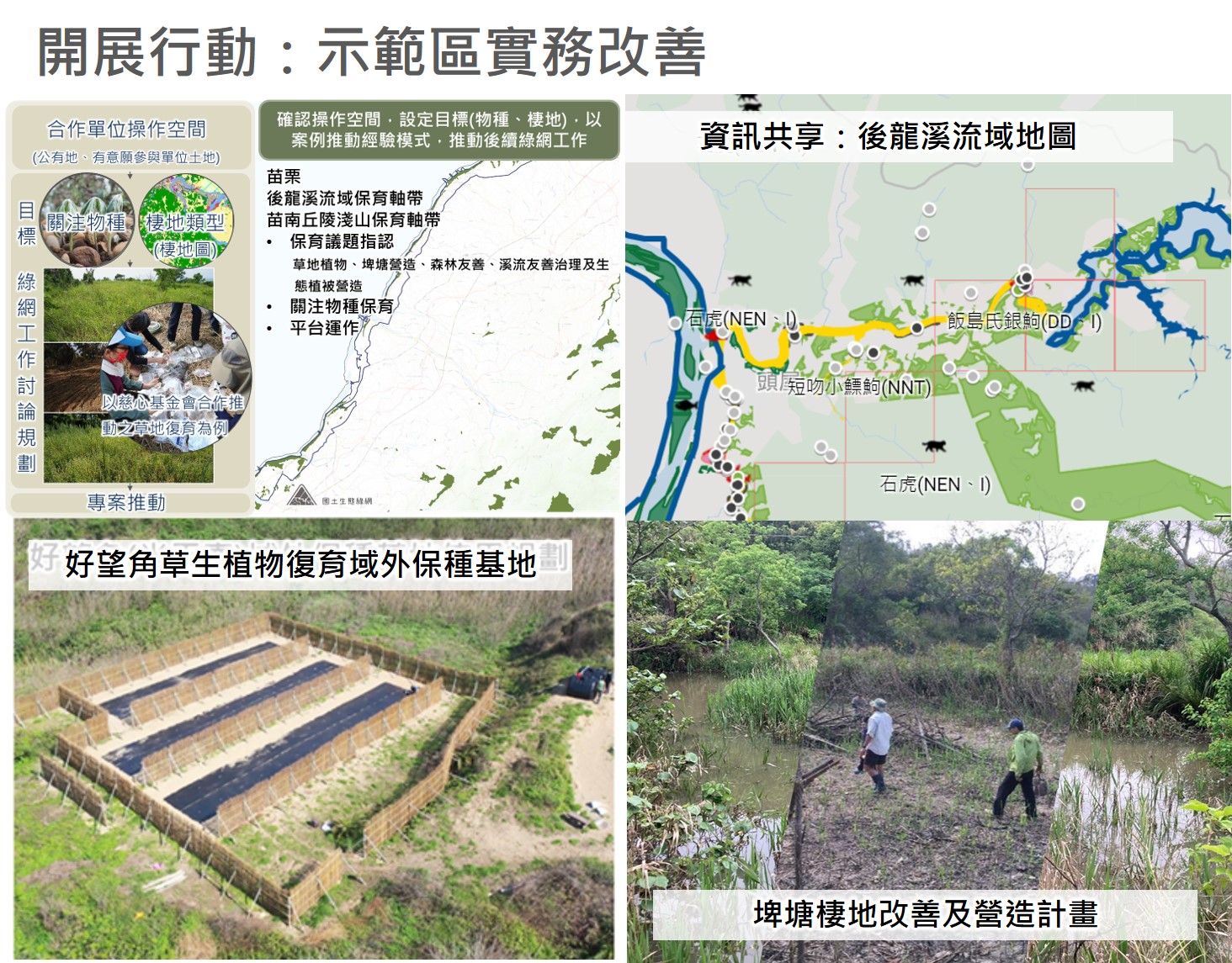 新竹林區管理處自111年起以後龍溪流域及苗南丘陵淺山二處保育軸帶作為台灣西北部生態綠網示範區域,攜手跨域夥伴投入保育實踐行動,現已成功建構公私協力積極互動模式,並為台灣西北部生態綠網合作網絡編織堅實基礎,今(28)日舉辦「台灣西北部國土綠網成果」分享會,攜手經濟部水利署第二河川局、農業委員會水土保持局臺中分局等超過20餘個公私部門、民間團體及企業界夥伴,向外界展現跨單位攜手共寫的國土保育新篇章。 新竹林區管理處夏榮生處長指出,新竹處在107-109年針對台灣西北部區域進行全面向生物資源及人文地理盤點與調查,彙整石虎與臺北赤蛙等410種關注野生生物與其棲地偏好,並優先指認「桃竹苗海岸濕地」、「桃園埤塘平原濕地」、「鳳山溪與頭前溪流域」、「後龍溪流域」及「苗南丘陵淺山」等5處區域保育軸帶,進行中尺度保育行動策略。當中,分布有一級保育類野生動物石虎、飯島氏銀鮈及列名植物紅皮書等級的草地稀有植物的「後龍溪流域及苗南丘陵淺山保育軸帶」成為優先示範區域,由跨部會中央機關、地方政府及在地保育團體共同投入保育行動,展現了極佳的公公、公私合作的實務案例,今(28)日特別舉辦邀請各議題關鍵投入夥伴,向各界分享實務經驗與成果。 今天的成果分享會中,新竹處首就台灣西北綠網平台的運作,逐步梳理指認出區域保育軸帶,進而發展有效的保育行動議題進行引言。同時透過多位講者的分享,諸如:在苗南丘陵淺山保育軸帶中的好望角重點推動區域,當地廢耕的埤塘如何被篩選發現其保育價值、建構埤塘營造標準流程、如何整合權益關係人或協力資源投入,架構出埤塘營造的脈絡;又如新竹處在友善生態植被營造工作破除過去造林的框架,挑選出最適合淺山、溪流、埤塘的友善生態植被,進一步攜手水土保持局臺中分局,善用水土保持工程旁裸露地,快速恢復植被,並進而提供野生動物棲息與利用廊道。 然而並非所有土地都是政策工具可以快速導入的國公有土地,當面臨私有土地時,除了友善耕作外,如何結合公眾社群力量,保全淺山森林環境,山貓森林吳金樹召集人也跟大家細數如何與公部門開啟合作,發揮公眾力量參與保育行動;經濟部水利署第二河川局也分享,在台大團隊調查研究得基礎下,如何兼顧飯島氏銀鮈保育課題推動友善水利工程。而除了大家關注的野生動物外,包括漏盧、破傘菊等受威脅植物的保育策略,結合慈心基金會月稱光明寺信眾、草地植物分布熱區所在的通霄新埔國小學童共同參與保育復育的行動,讓保育工作的落實進到社區、村落與學校。 此次成果分享會的舉辦,凝聚了各界力量,彰顯了我們對於國土保育的共同關注與努力,我們期待透過這個平台,促進各項保育行動的深入合作,共同創造一個更美好的自然環境,並歡迎更多的跨軸帶、跨領域公部門、企業和非政府組織一同加入我們的行列,攜手共譜國土保育新篇章。