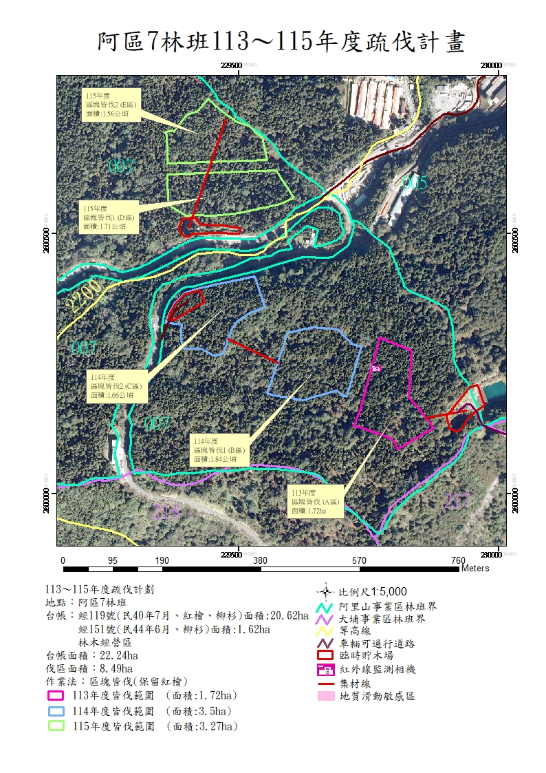 標售內容: (一)編聯號碼:113嘉標木2-1號(第1次標售)。 (二)處分地點:阿里山事業區第7林班、面積8.49公頃 (三)作業別:標售處分(皆伐5伐區) (四)材種及數量:柳杉立木材積7620.54.72立方公尺、紅檜立木材積1.75立方公尺,合計立木材積7622.29立方公尺。 (五)採運期限:至116年11月30日止(分3年伐採及分3期繳納得標價金)。 (六)投標文件截止期限:113年11月6日上午9時0分。 (七)開標時間及地點:113年11月6日上午10時0分,於嘉義分署(嘉義市林森西路1號)1樓會議室開標。 二、現場勘查: 113年10月30日上午10時00分於嘉義分署阿里山工作站(嘉義縣阿里山鄉香林村17號)集合後,由工作站派員引導至標的物地點現勘。(聯絡單位:阿里山工作站,聯絡人:蔡騰奇,電話05-2679715#821)。 三、其他事項詳如標售公告及投標須知。