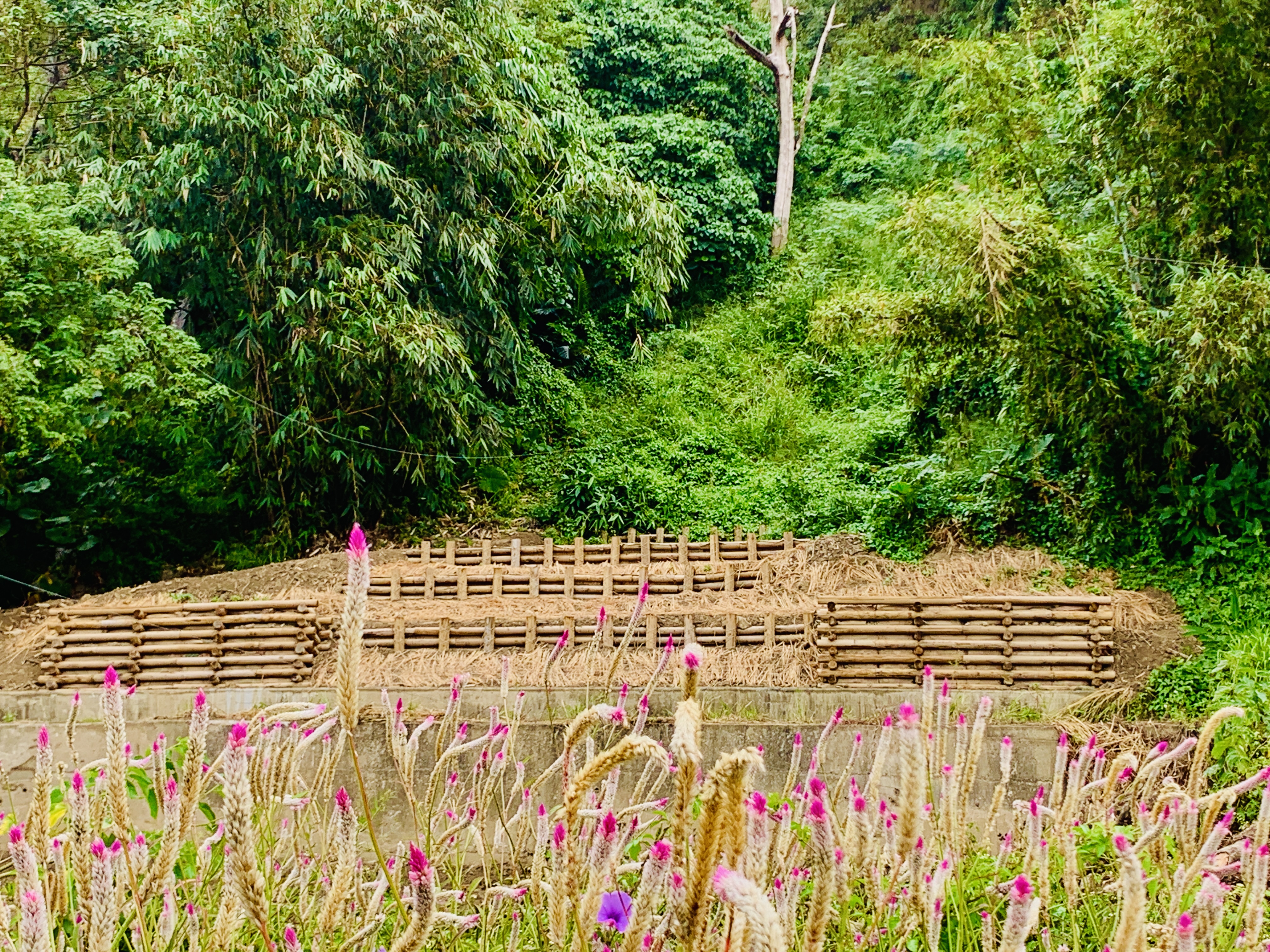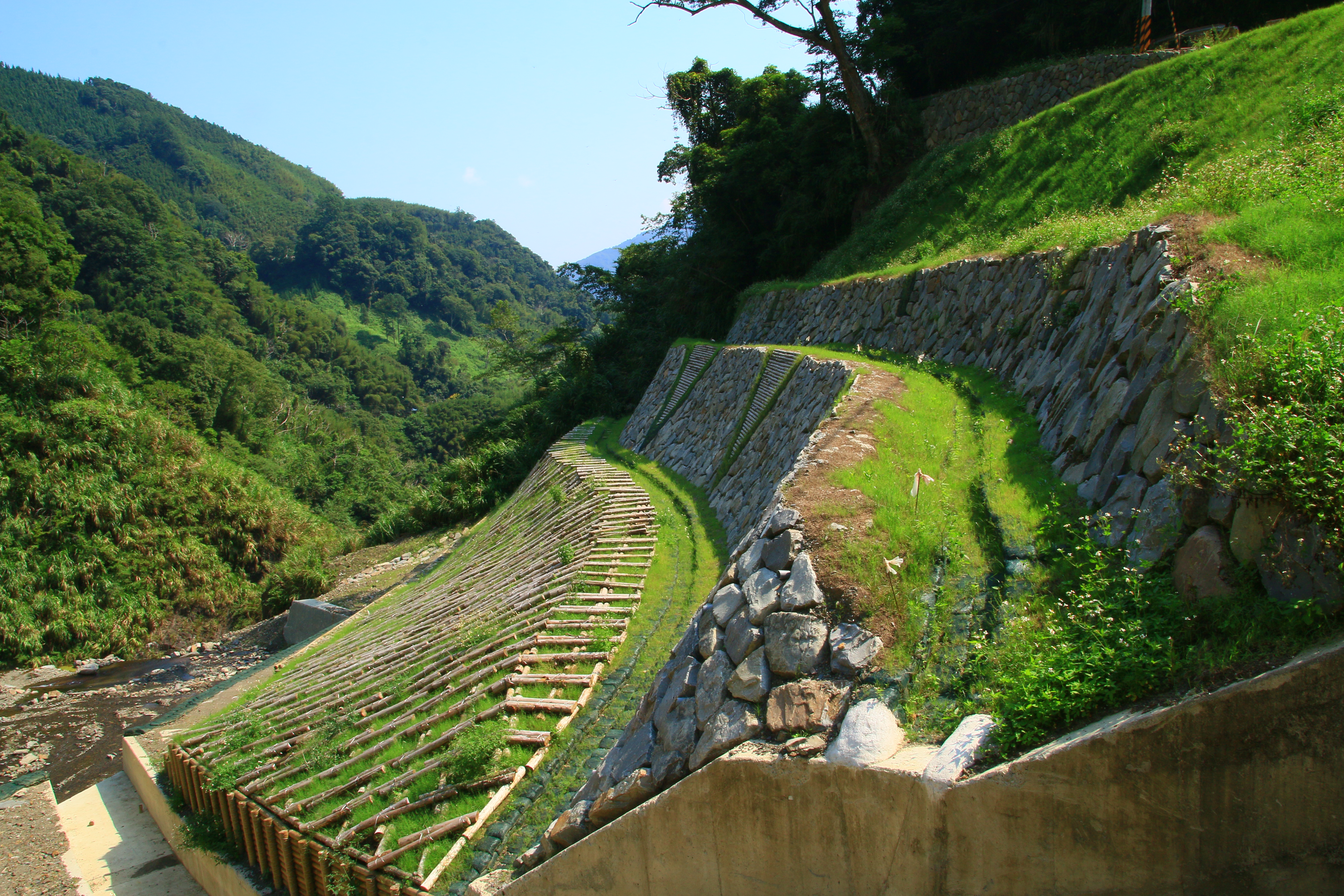 - 工程採取打樁編柵、埋設植生球、植生阡插、撒播種子、鋪設稻草蓆及採用國產材施作木格柵、木格框等自然方式處理邊坡崩塌問題。