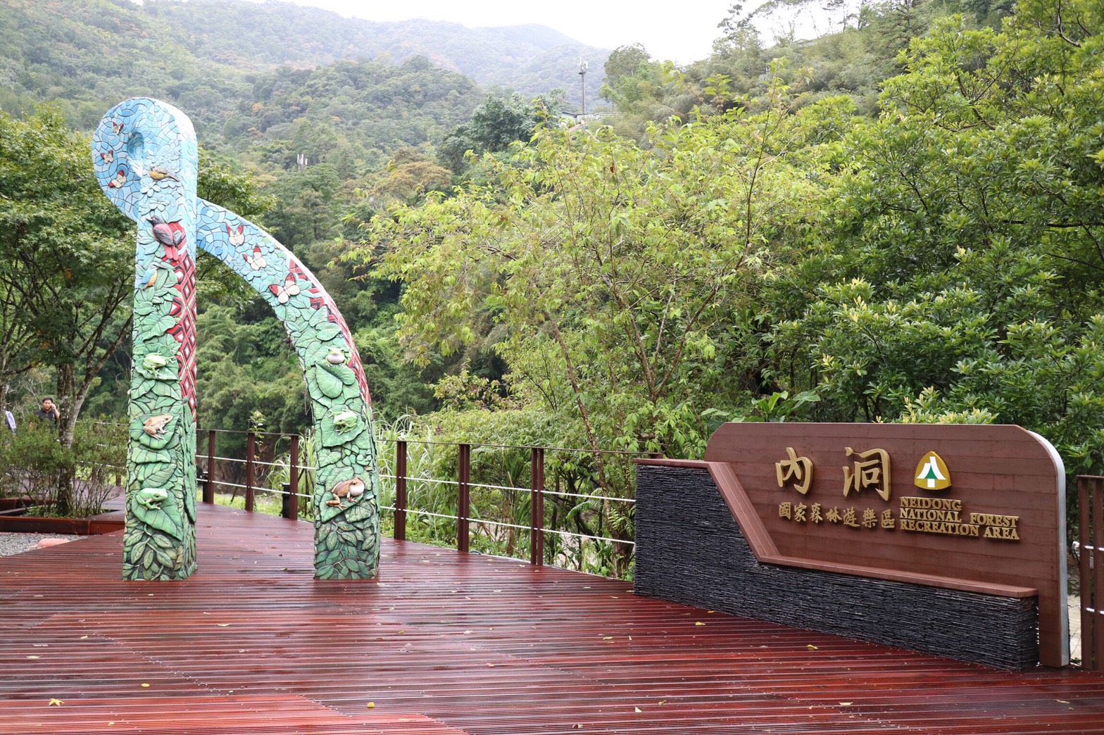 採用大型陶板立體雕塑,展現內洞園區豐富生態特色並結合當地泰雅原住民特色圖騰,創造景觀亮點提升觀光價值,並展現本處重視在地文化、活絡當地觀光之夥伴關係願景。
