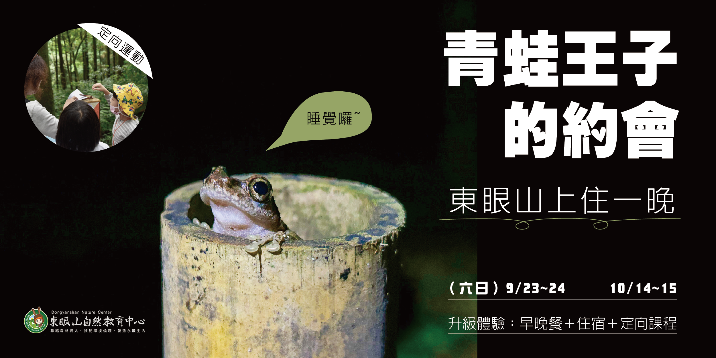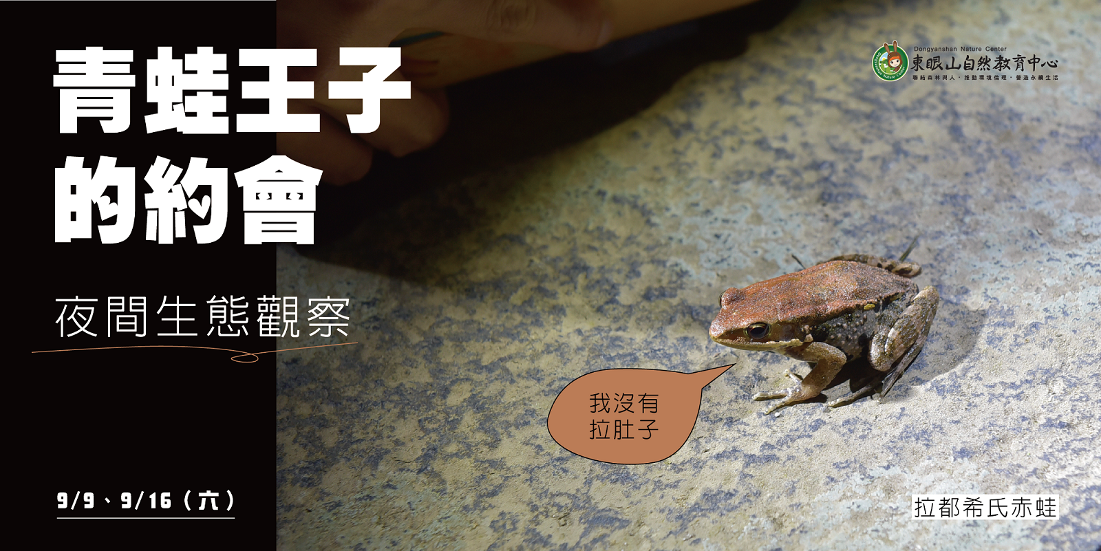 山林入夜之時,是誰高聲鳴唱情歌?又是誰隱身等待美麗的邂逅?快來東眼山一探究竟,與青蛙王子來一場浪漫的約會時光。林業保育署新竹分署東眼山自然教育中心辦理「青蛙王子的約會」系列活動。有單日型與過夜型兩種型式可供選擇,歡迎對青蛙生態與夜間觀察有興趣的朋友,於8月14日上午9點,至台灣山林悠遊網預約報名。(報名連結單日型:https://recreation.forest.gov.tw/Education/Course?Id=DYS-A21203/過夜型:https://recreation.forest.gov.tw/Education/Course?Id=DYS-D1213)。 東眼山的自然生態良好,環境適合青蛙生長,因此一年四季都可以觀察到青蛙。本次的活動由專業的國家森林解說志工和環境教育教師帶領,介紹蛙類的生態,以及走訪夜間森林觀察生物,在森林裡有機會一窺金色眼線的翡翠樹蛙、穿紅色豹紋絲襪的莫氏樹蛙,還有叫聲如鳥兒般清脆的斯文豪氏赤蛙等十多種蛙類。單日型「青蛙王子的約會:夜間觀察活動」於09月09日及16日兩個週末辦理。費用每人350元。過夜型「青蛙王子的約會:東眼山上住一晚」於9月23日~24日及10月14日~ 15日辦理,除了介紹青蛙生態外,還能參與定向運動活動,活動費用為每房10,800元(6人,可加床至8人)。 東眼山自然教育中心位於東眼山國家森林遊樂區,園區位於桃園市復興區,蘊含豐富的森林生態資源,是民眾親近自然的好去處,也是優質的環境教育設施場所。本次的「青蛙王子的約會」活動,相當適合家庭親子參與,一起到森林裡認識蛙類,體認保育生物多樣性的可貴。欲知更詳細的內容及報名資訊,請上本中心「東眼山自然教育中心-環境教育/戶外學習」FB粉絲專頁:https://www.facebook.com/DYSNEC。有任何疑問,也歡迎撥打03-3821533洽詢。