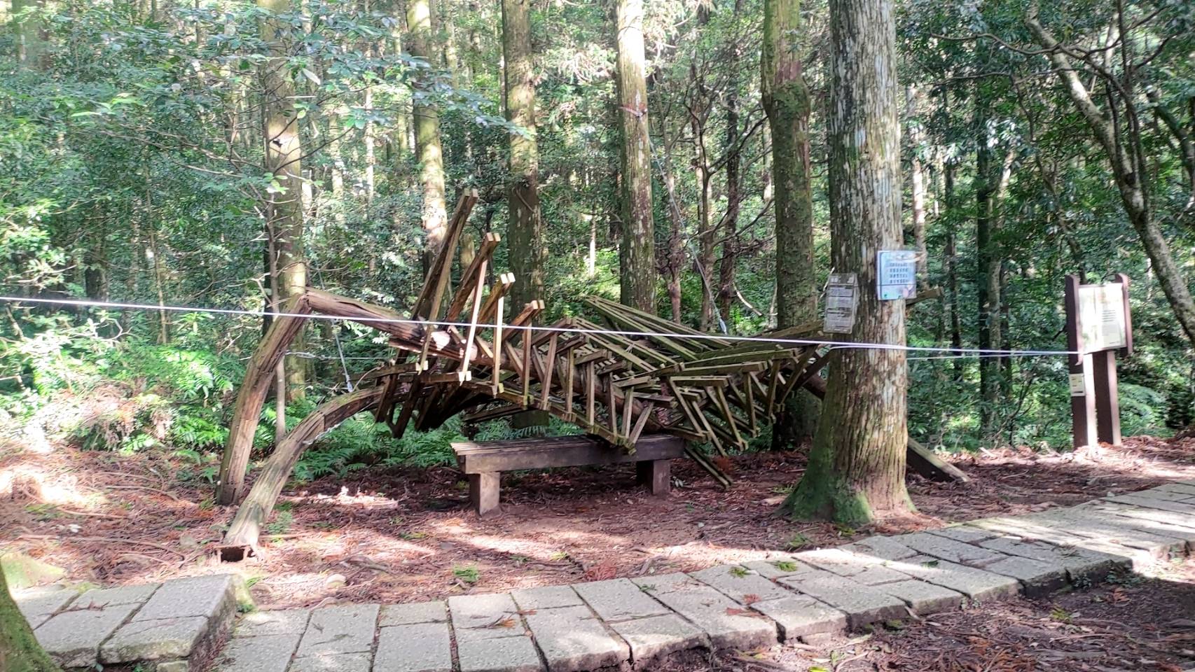 林業保育署新竹分署指出,森林木十人團隊以對生態環境最小影響為創作原點,同時思考鑲嵌、融入在森林自然生態中,建構出具有永續性、並能回歸土地的木構休憩設施,作為友善設計與工法的核心理念誕生,作品完成迄今吸引許多遊客駐足歇息與拍照。結構主體以友善環境之自然建築理念,採用不施加防腐藥劑的柳杉原木構築,原預估搭設一年後即需解構,然而「脊森」超出預期,成功展現原木材料堅韌同時又柔軟的生命力,在東眼山森林矗立超過了四個年頭17個季節,最終在今(112)年10月5日小犬颱風強風下,完結其自然構築設施的年限,但「脊森」這件作品相信帶給東眼山旅人的印記深植。