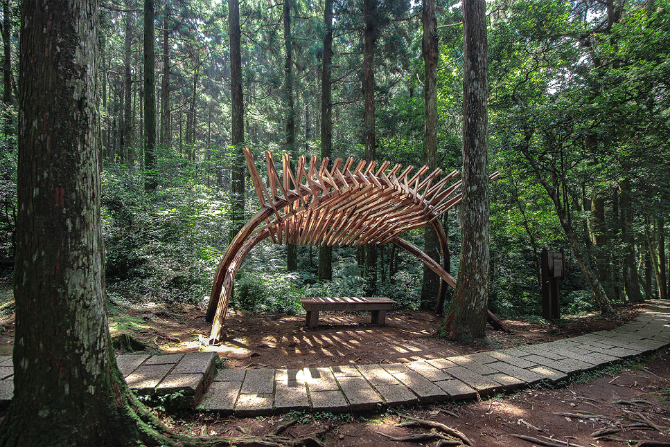曾經矗立於東眼山國家森林遊樂區自導式步道旁的國產材裝置藝術「脊森」,是由淡江大學建築系首屆森林木十人團隊於2019年駐地東眼山森林15晚,親身感受森林脈動譜寫的生命篇章,具象創作而成的作品,隨著光影的變化,映襯出巧奪天工的彎曲線條,並榮獲2020臺北設計獎的殊榮。