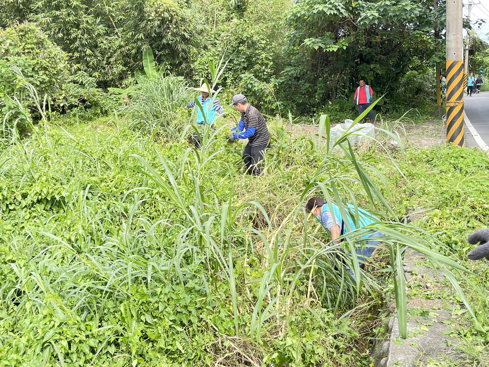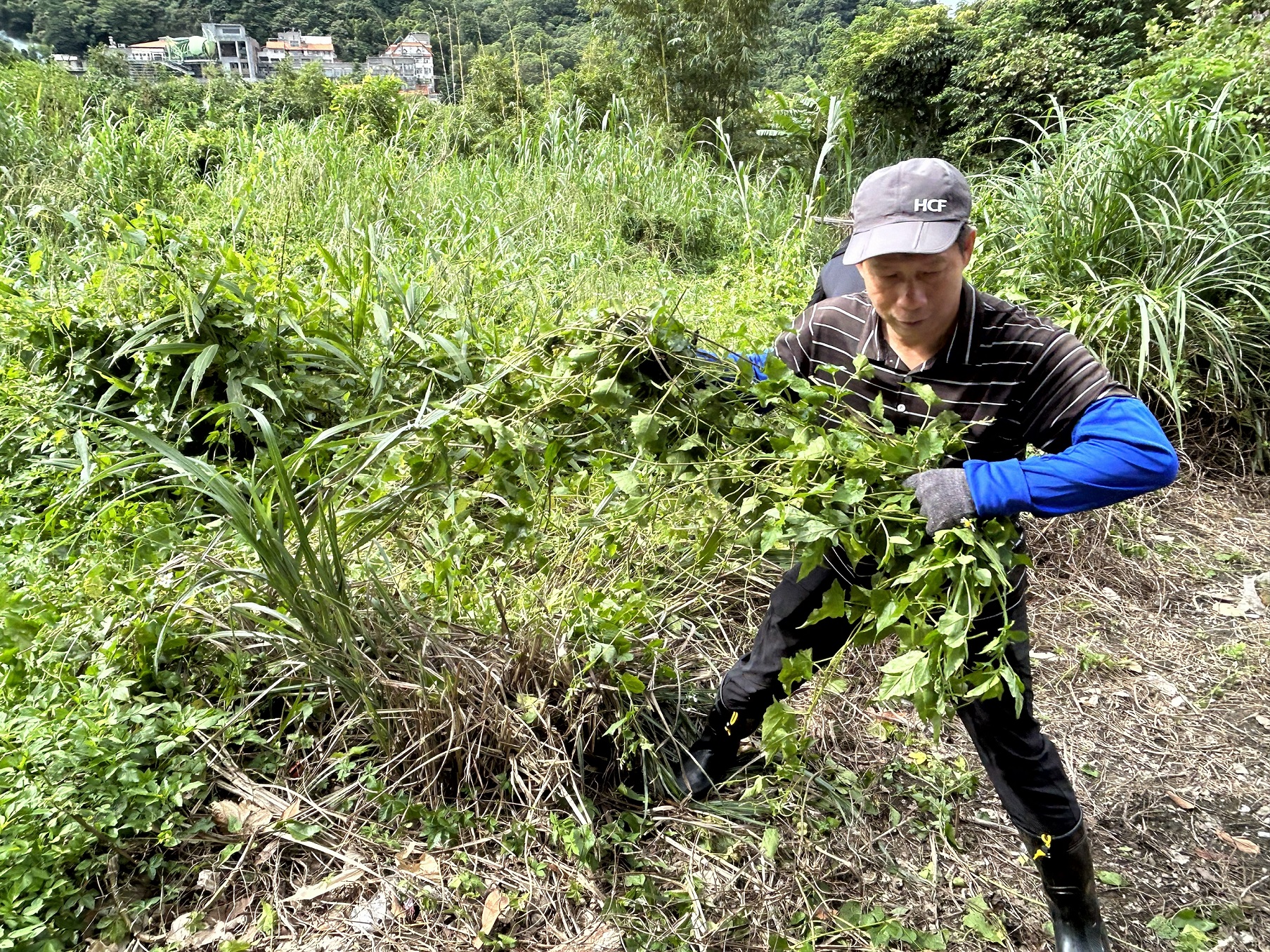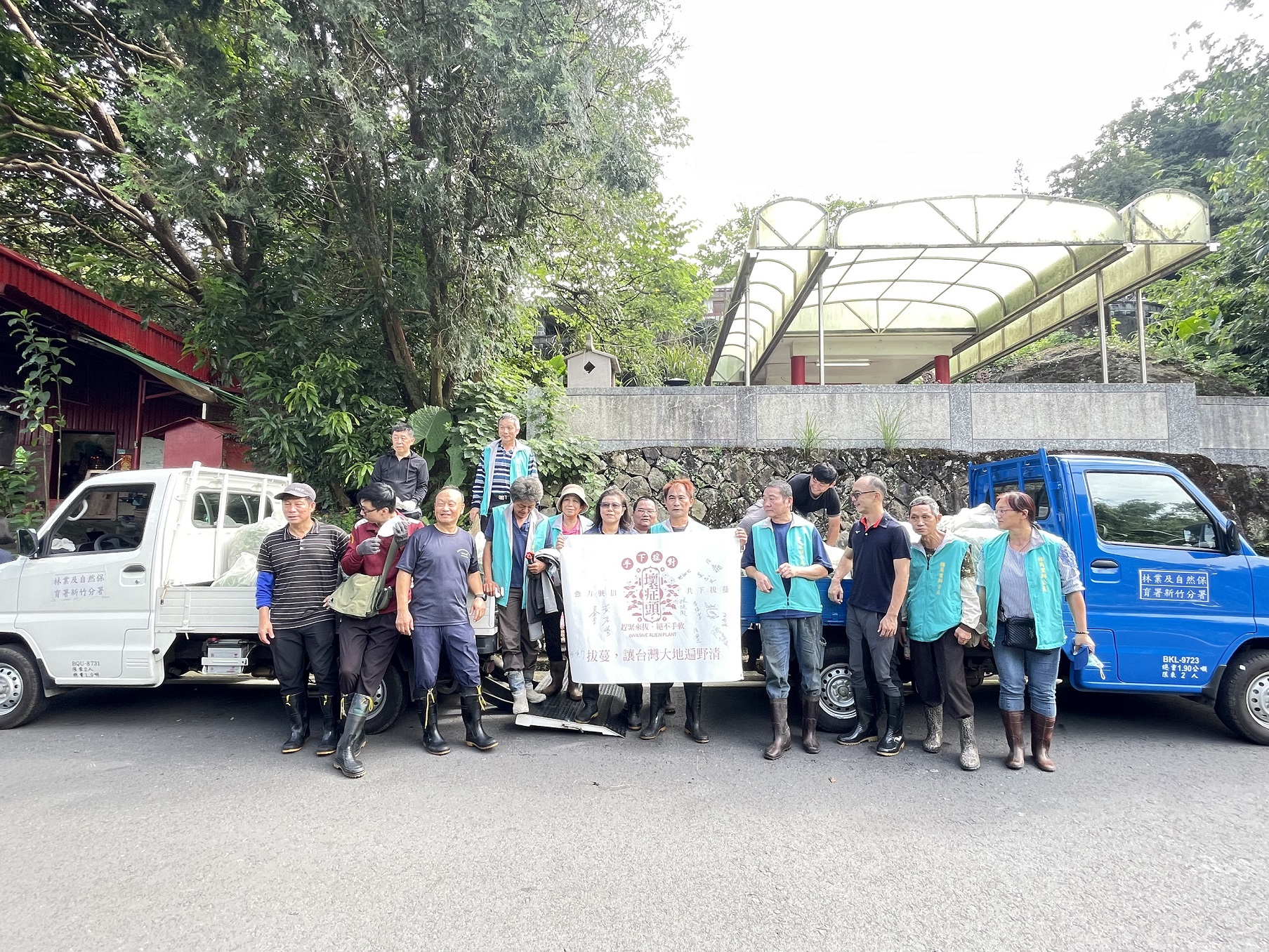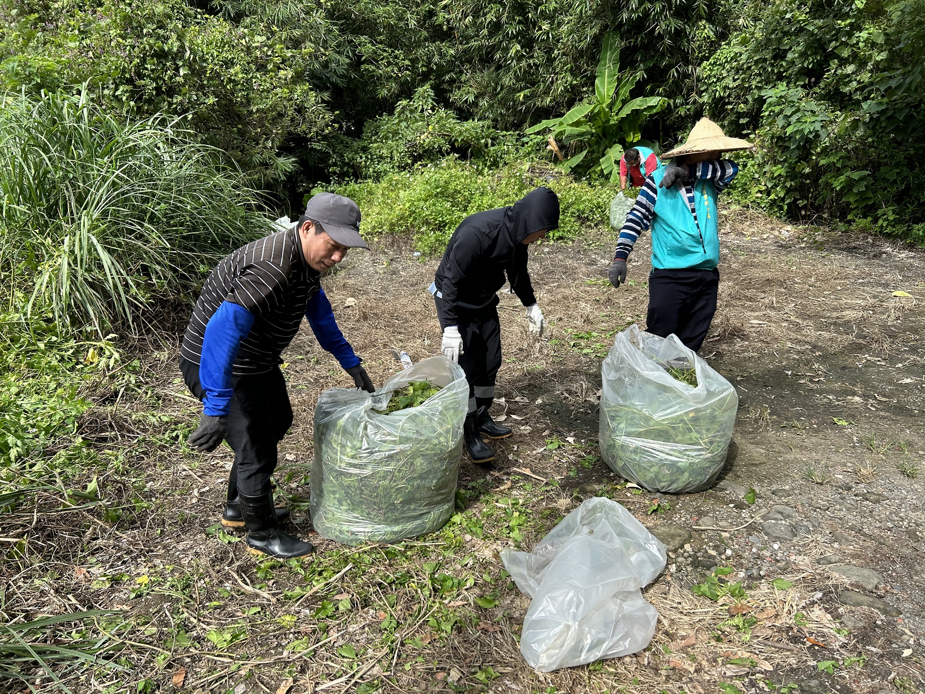 今日現場由新竹分署三峽工作站主任林純徵、添福里里長陳秉源、插角里里長劉添財共同號召社區民眾及新竹分署三峽工作站同仁合計20餘人,協力剷除社區內休耕農地及周邊林地內的小花蔓澤蘭,合計約200公斤,成果豐碩。