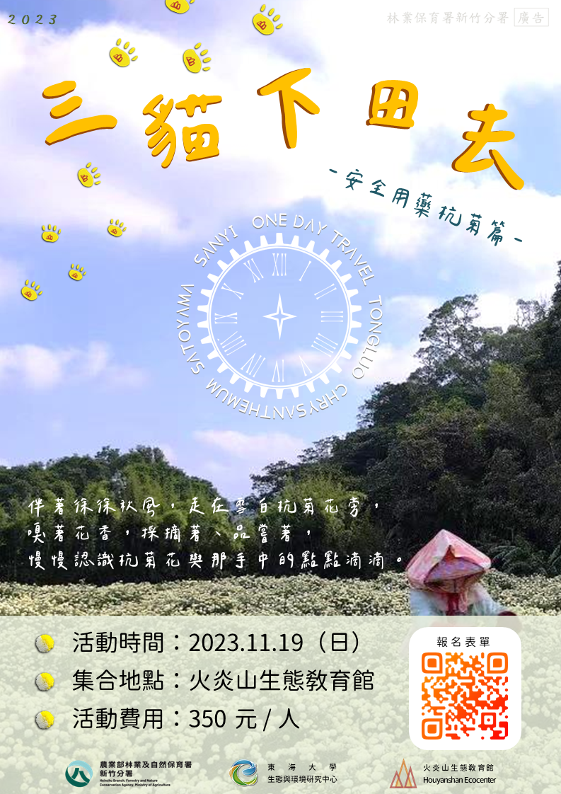 林業及自然保育署新竹分署將於11月19日(週日)在火炎山生態教育館舉辦「三貓下田去」主題活動。這場活動由火炎山生態教育館講師領隊,引領參與者深入三義周邊的農田,透過友善環境的農事體驗,感受人與大自然的共融之美。 火炎山坐落於苗栗三義鄉,苗栗地區地勢多變且擁有豐富的淺山生態和多樣的人文歷史。這片土地孕育出各類農產作物,從稻米到果園,再到其他經濟作物,每個季節都呈現獨特的風貌。 近年來,食安風波不斷,大眾的環境保育意識抬頭,關於「有機農業」、「友善農法」等等議題備受矚目。這不僅為消費者提供了安心的食品,也見證了土地的回春,野生動物回到農田中建立豐富生態的樣貌。而在常見的慣行農法轉型為有機、友善農法的過渡時期,農民選擇適量使用農藥、避免使用除草劑、並拒絕使用對野生動物有害的材料,以降低對生態的衝擊,是新竹分署持續推動的政策目標;期望農民在掌握正確的友善環境農法後,能夠漸進地邁向有機、友善農法的道路。 11月19日我們將跟隨三貓陛下一同前往銅鑼的杭菊花田,分享那些年種花的美好故事。讓大家認識安全用藥的農事點滴,實地觀察友善的農事環境和大自然愜意相融的景象。 活動將於10月28日(六)中午12點開放線上報名,名額限定25位,誠摯邀請大家踴躍參與,與三貓一同啟程,共同感受這場自然之旅的奇妙魅力。報名資訊將公告於: Facebook官方粉絲專頁https://www.facebook.com/hoyenshan/ 官方網站http://hoyenshan.org/index.php?id=00070 Beclass線上報名https://reurl.cc/20Yo6E