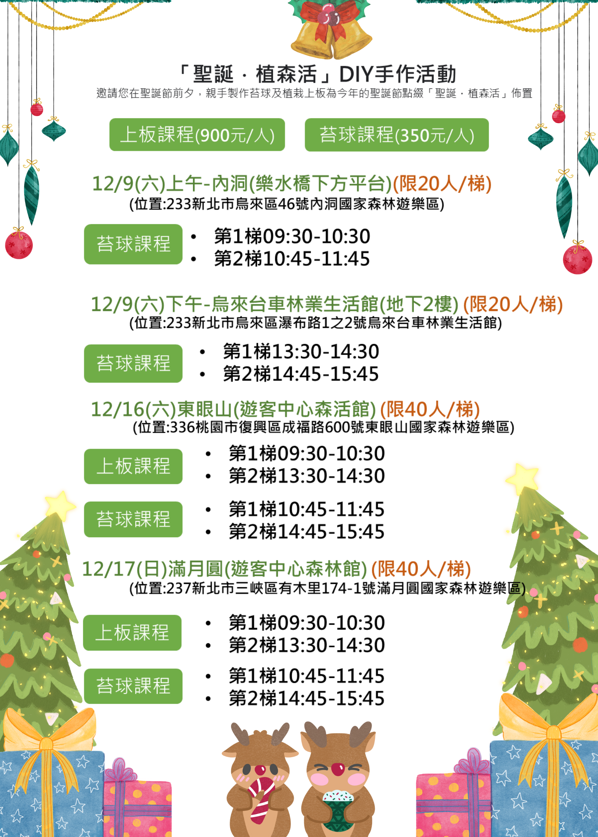 「聖誕.植森活」DIY手作活動的苔球及植栽上板,透過療癒的植栽及專業講師講解擺放與構圖技巧,讓學員發揮想像,激發美感,創造獨一無二的聖誕植栽,並可近距離體會冬季山林幽靜之美。活動採線上報名預約,苔球課程每人收費350元、植栽上板課程每人收費900元(皆未含入園門票),報名表單:https://forms.gle/9woCGY1y9KQWfUPu5。更多課程資訊請參考山林悠遊網或電洽林業及自然保育署新竹分署03-5224163。