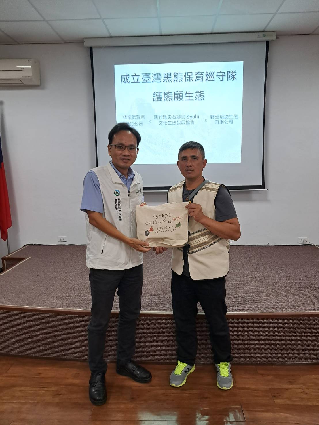 新竹縣尖石鄉養老yulu文化生態發展協會響應林業及自然保育署新竹分署推動之「臺灣黑熊生態服務給付示範計畫」,成立黑熊保育巡守隊,於霞喀羅國家步道區域進行臺灣黑熊巡守工作、自動相機監測並向登山遊客宣導人熊相遇之因應及無痕山林等保育概念。養老協會近年協助新竹分署執行霞喀羅國家步道清潔維護及白石駐在所維管工作,本次與新竹分署推動成立轄內第一個臺灣黑熊巡守隊,新竹分署於本(112)年11月27日由林秘書宜羣授證予協會代表及辦理巡守隊成立宣示,並邀請野聲環境生態有限公司見證,為守護臺灣西北部地區臺灣黑熊族群及棲地資源一同努力。