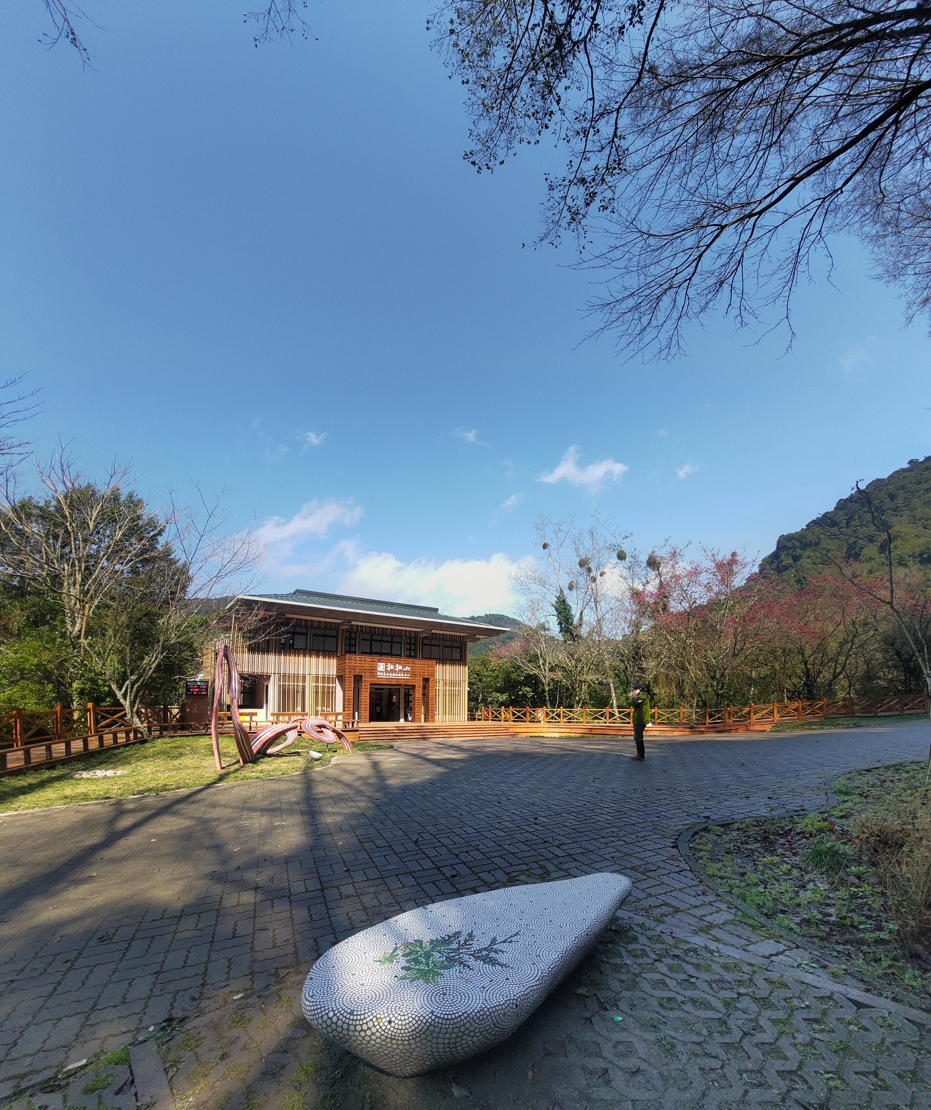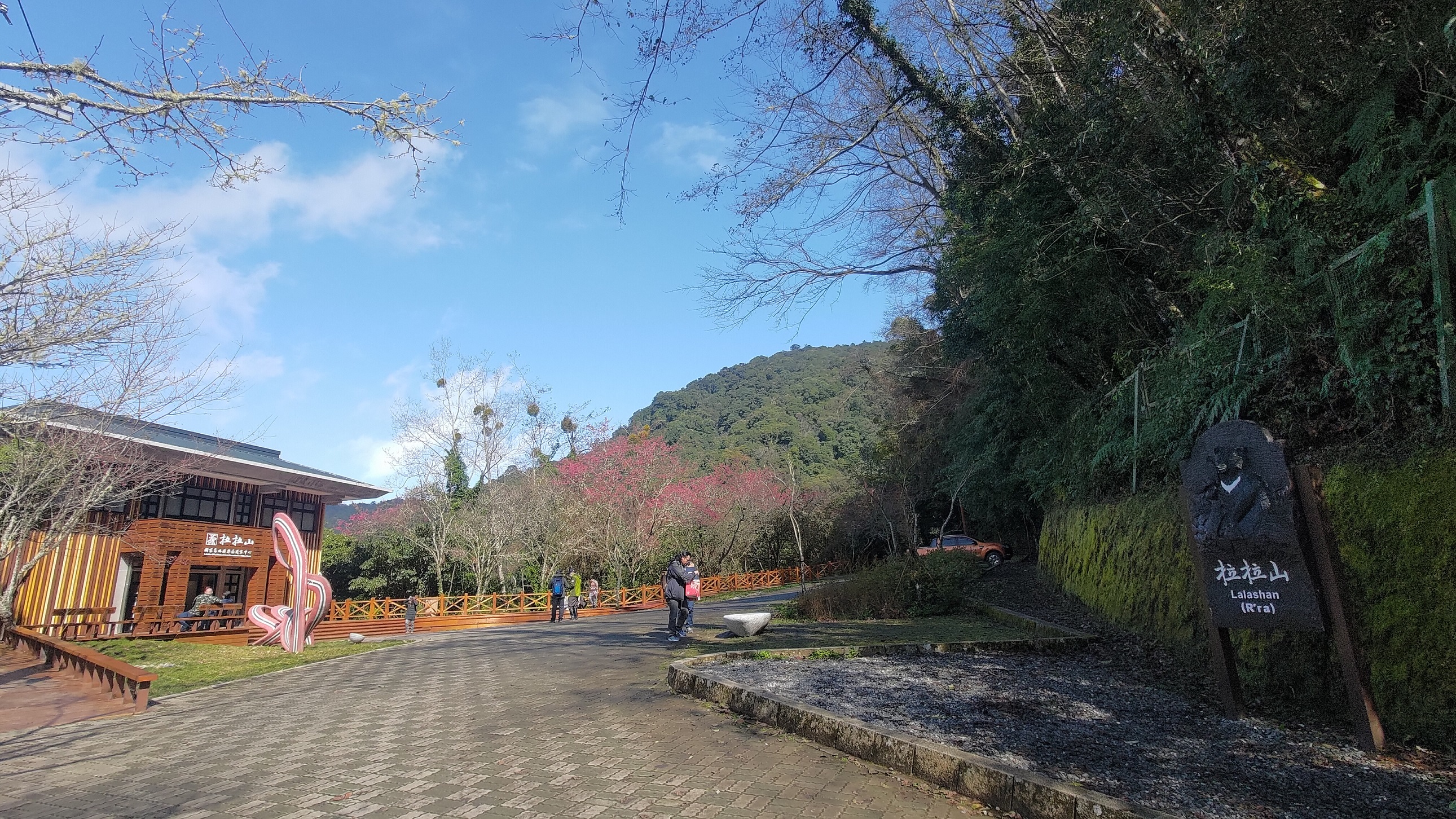 新竹分署夏榮生分署長表示,拉拉山國家森林遊樂區是全台第一座由在地部落居民與政府機關凝聚共識,共同推動成立的國家森林遊樂區,去(112)年4月18日開園服務以來,區內各項軟硬體設施已大幅優化及提升。與此同時,也積極思考透過公共藝術設置提升遊客中心周邊美學環境,藉由在地部落會商與徵件,最後由深耕桃園多年的蘇福隆藝術家以「繚繞」為作品發想起點,結合泰雅族傳統紅、黑、白圖騰色彩,勾勒出「R'ra」字樣的創意獲得肯定,並成功運用玻璃纖維強化水泥(GRC)及馬賽克磚複合材料特性打造出鮮明又立體的作品-「與森林共舞」,意喻著宛如絲帶般的拉拉山雲霧及泰雅文化在交織融合下,引領遊客循著線條的路徑,造訪千年的巨木林間,與森林一同共舞。仔細留意,在作品不遠處還有一朵以馬賽克磚拼接而成的雲朵與作品相互呼應。拉拉山國家森林遊樂區春節期間,除夕休園以外,歡迎國人來走春欣賞作品並賞櫻看巨木。