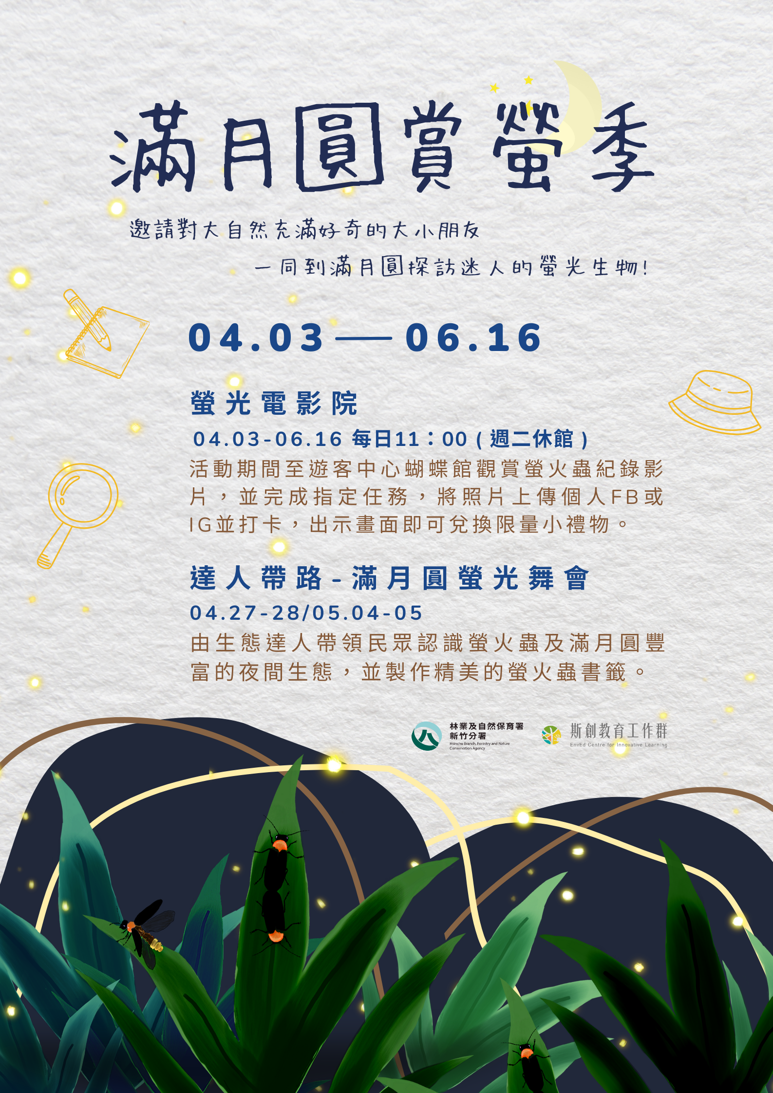 林業保育署新竹分署表示,滿月圓賞螢季規劃於4月27日、4月28日、5月4日、5月5日舉辦四梯次【達人帶路-滿月圓螢光舞會】夜間活動,由螢火蟲達人帶領認識螢火蟲生態習性及滿月圓豐富的夜間生態,此外還能親手製作精美的螢火蟲書籤,將與螢火蟲相見的回憶帶回家。活動採預約報名制,即日起開放線上報名,每梯次開放30人,計120位名額,額滿為止(四梯次皆已額滿,開放候補)。