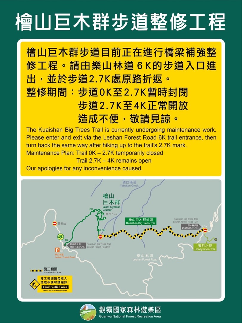 為維護遊客遊憩安全,林業及自然保育署新竹分署自113年4月30日起至10月31日止,辦理觀霧國家森林遊樂區檜山巨木群步道橋梁補強整修工程,因山區運送材料費時且施工困難,步道0K(樂山林道1.2K入口)至2.7K處路段,暫時封閉,遊客請由樂山林道6K步道入口進入檜山巨木群步道,並於步道2.7K處「原路」折返。 為維護登山安全,請遊客遵循現場指標牌誌指示,行走於步道範圍,請勿進入封閉的施工區域,避免發生危險,行進時務必留意自身體能及身體狀況。最新步道開放情形,將即時公告於台灣山林悠遊網(http://recreation.forest.gov.tw),若有任何訊息通報或旅遊問題,敬請電洽觀霧國家森林遊樂區(電話:037-272917)或林業保育署新竹分署(電話:03-5224163分機235)查詢。