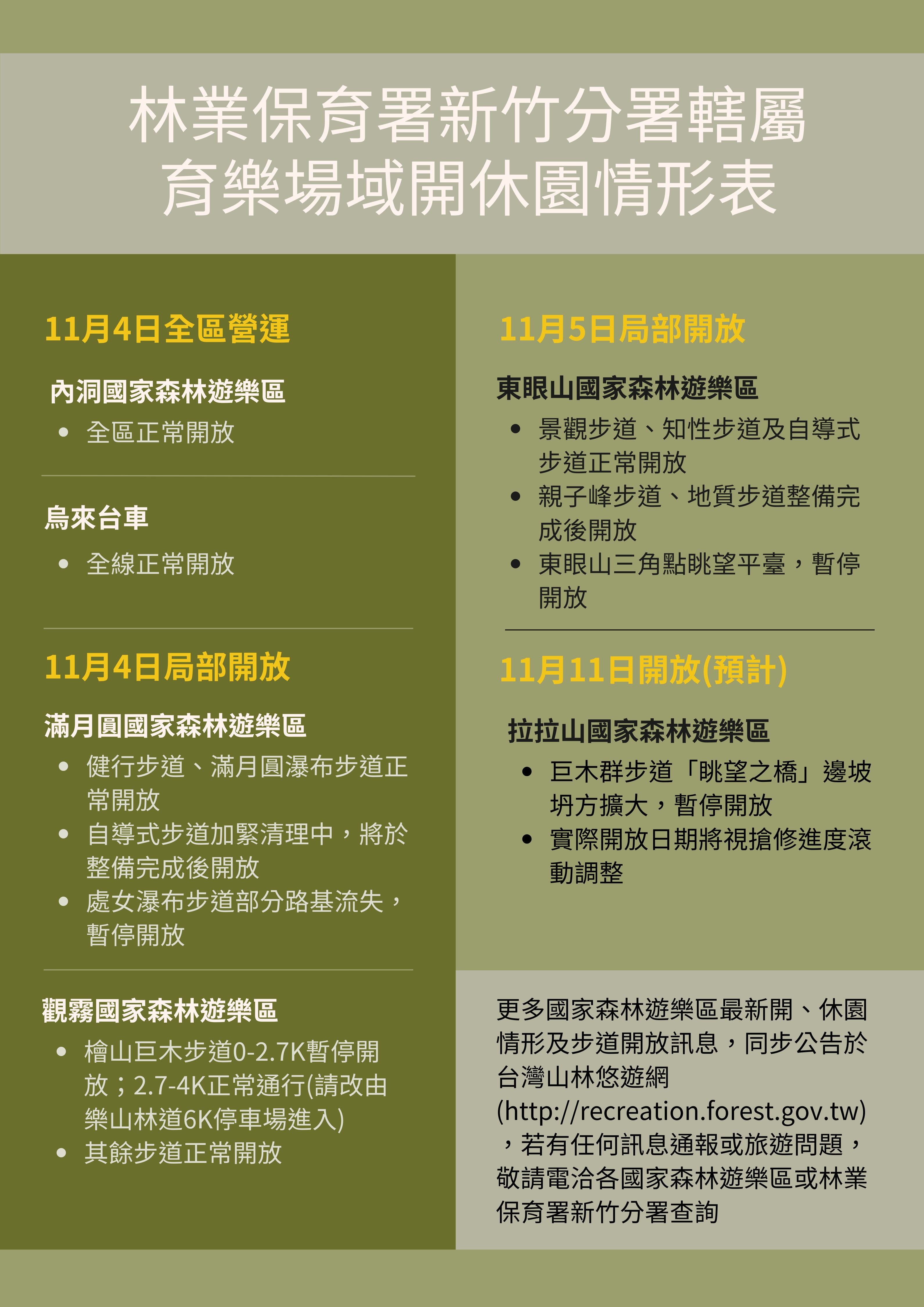 康芮颱風雖已遠離,林業保育署新竹分署轄屬森林育樂場域所處山區受強風與降雨影響,各園區步道待清理倒木數量眾多,部分園區亦有邊坡坍方與路基流失等情形,經積極派員進行園區各項設施修復、環境整備後,內洞、滿月圓、觀霧國家森林遊樂區及烏來台車,將於11月4日(一)起恢復營運,惟部分園區仍有步道局部封閉情形;東眼山國家森林遊樂區因受聯外桃119道路搶通進度影響,為維護遊客行車安全,將配合延長至11月5日開放;拉拉山國家森林遊樂區因巨木群步道「瞭望之橋」邊坡坍方擴大,尚無法進行搶通,開放時間暫訂為11月11日,實際開放日期將視搶修進度調整。 各自然步道考量聯外道路及步道仍有落石及坍方風險,後續將俟巡查無虞後,再於台灣山林悠遊網發布開放動態;九九山莊則持續配合雪霸國家公園生態保護區管制,暫停服務;另火炎山生態教育館已於11月3日正常開館,11月4及5日則例行性休館。 林業及自然保育署新竹分署呼籲,颱風雖已遠離,西半部山區仍可能有局部豪大雨,上述園區亦持續進行園區環境整備,近期前往山區旅遊仍應注意自身安全,並留意當地氣象及園區開、休園資訊。 更多國家森林遊樂區最新開、休園情形及步道開放訊息,同步公告於台灣山林悠遊網(http://recreation.forest.gov.tw),若有任何訊息通報或旅遊問題,敬請電洽各國家森林遊樂區或林業保育署新竹分署查詢。 附件: 林業保育署新竹分署轄屬各育樂場域開休園情形一覽表 聯絡電話: 內洞:02-26617358 滿月圓:02-26720004 東眼山:03-3821505 拉拉山:03-3912142 觀霧:037-272917 烏來台車:02-26617712 九九山莊::03-5224163分機241或245 林業保育署新竹分署:03-5224163