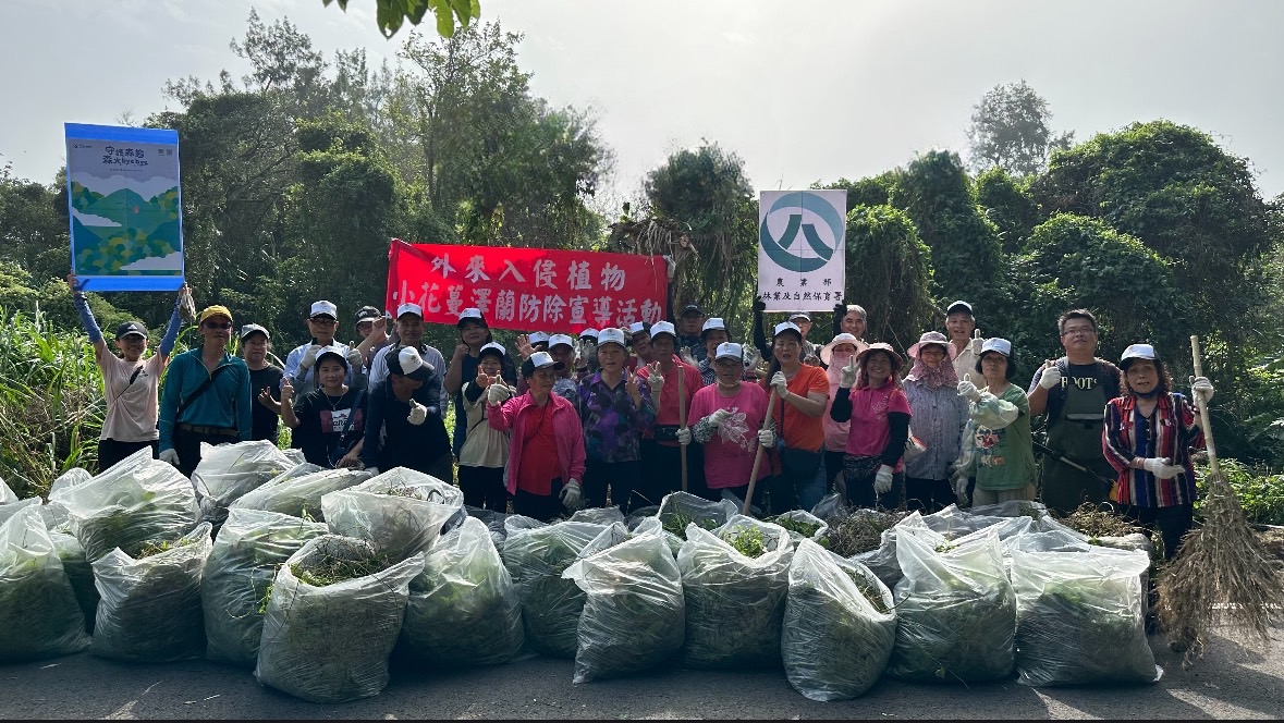 小花蔓澤蘭危害方式主要以藤蔓攀附及纏繞於林木樹冠上,造成原有植物因無法行光合作用而枯死。今(15)日由新豐鄉鳳坑社區與竹東工作站人員合計60人,剷除鳳坑社區內坑子口段自行車步道旁小花蔓澤蘭合計374公斤,成果豐碩。