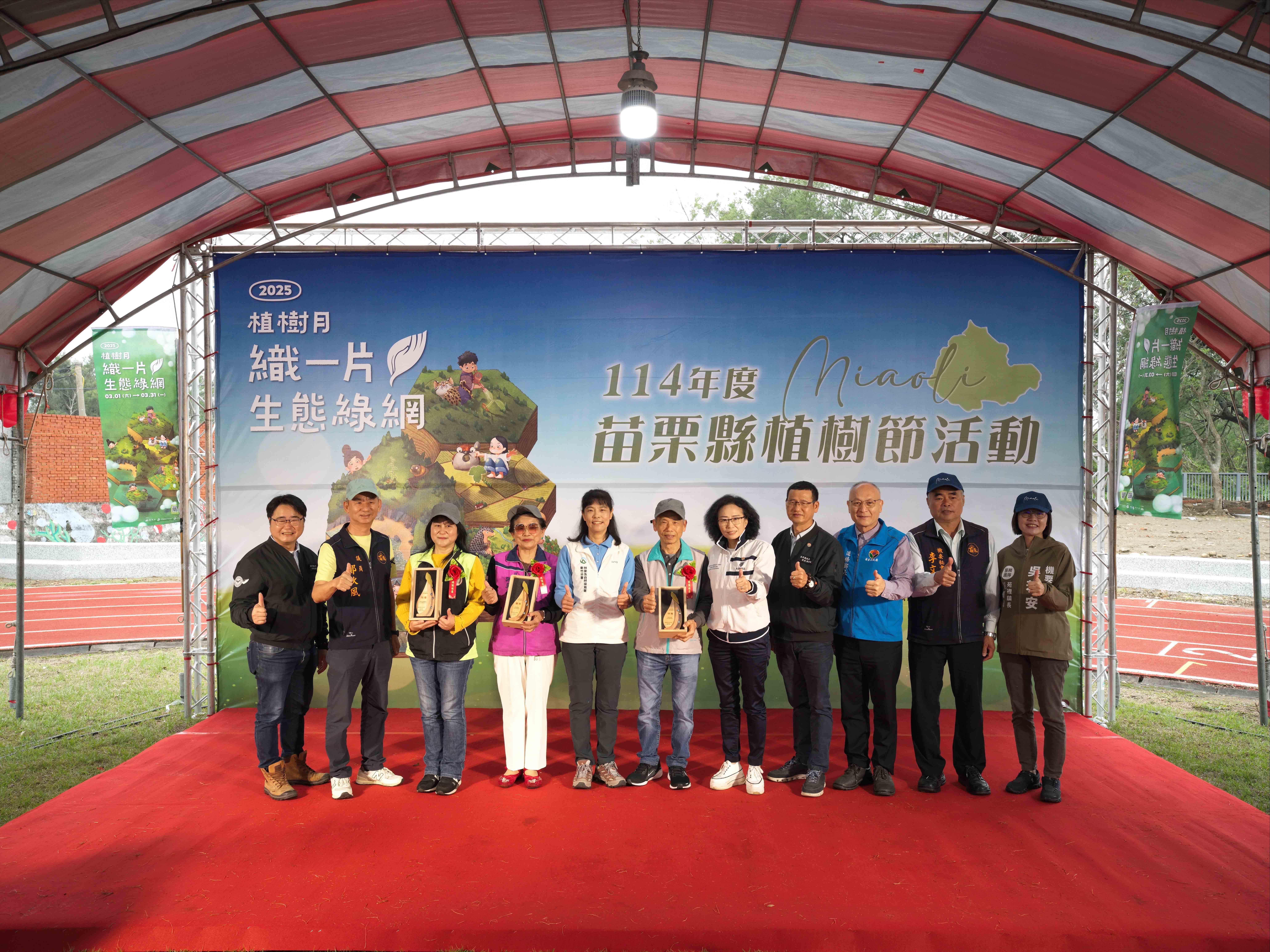 今日活動,由縣府頒發苗栗縣綠化有功人士及團體,新竹分署同時頒贈林業及自然保育署新竹分署推動結合社區、部落執行參與自然環境維護、在地人文發展與居民參與的「社區林業」計畫,113年獲得優異成果的苗栗地區績優社區包括獲得特優社區的「有限責任苗栗縣賽夏族原住民林業暨勞動合作社」、優等社區的「苗栗縣頭屋鄉明德社區」及甲等社區的「苗栗縣竹南鎮海口社區發展協會」。苗栗縣賽夏族原住民林業暨勞動合作社持續推動「苗栗縣南庄鄉加里山地區護林森力軍巡守」,致力於山林環境保護巡查、違法案件的通報及山區無痕山林環境教育推廣,夥伴投入參與保育行動成效卓著。明德社區發展協會,以野蜂復育為核心,進行養蜂活動對環境的影響調查,改善社區周邊生態環境並促進社區產業發展,兼及生態與文化傳承。海口社區發展協會積極投入保安林維護、環境教育與生態保護,提升學童與居民的環境意識,展現在地投入參與的卓越成效。三個社區由森林周邊連接到平原丘陵,更擴及至海岸保安林棲地維護,落實人與自然共生的理念。