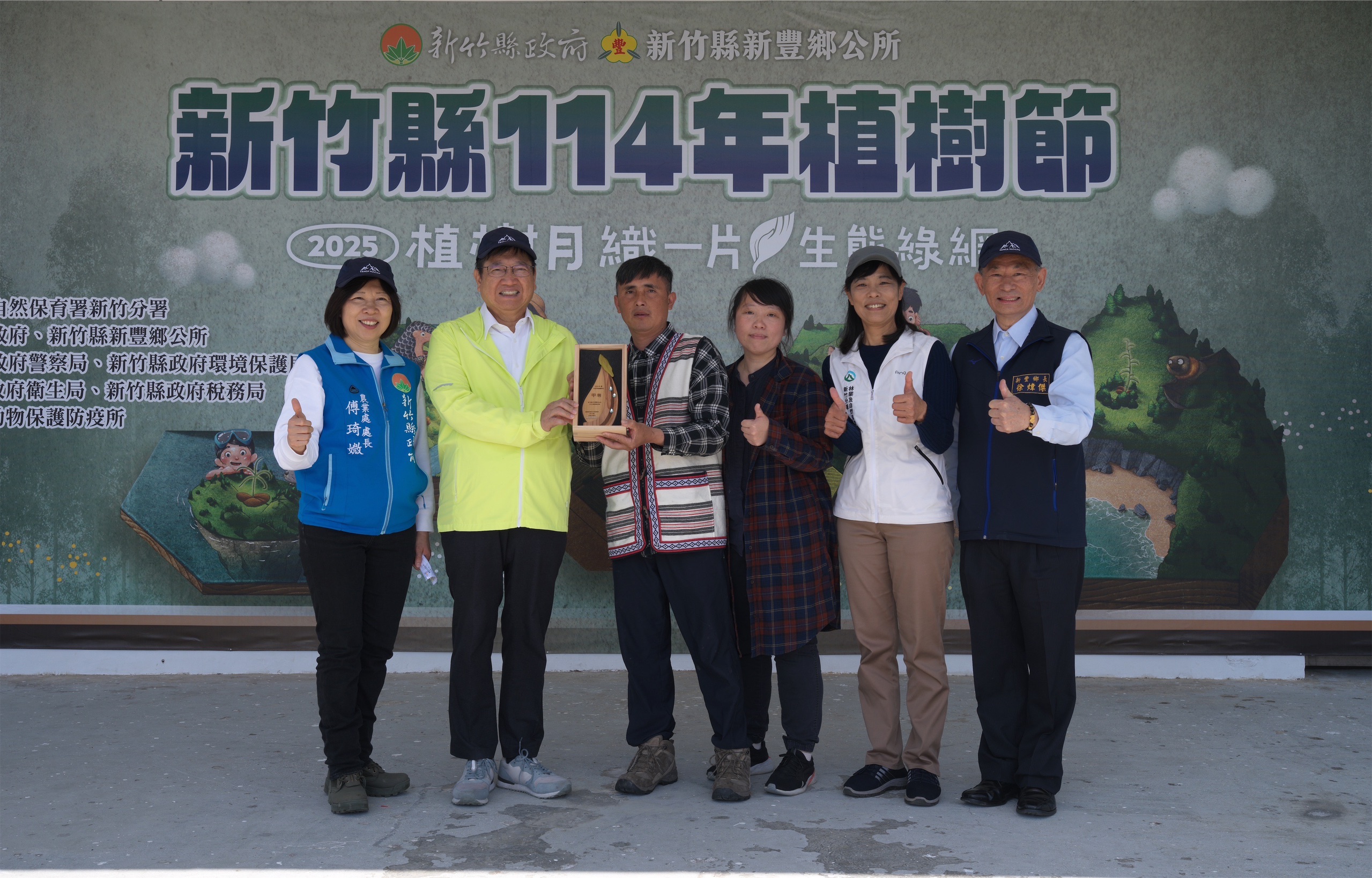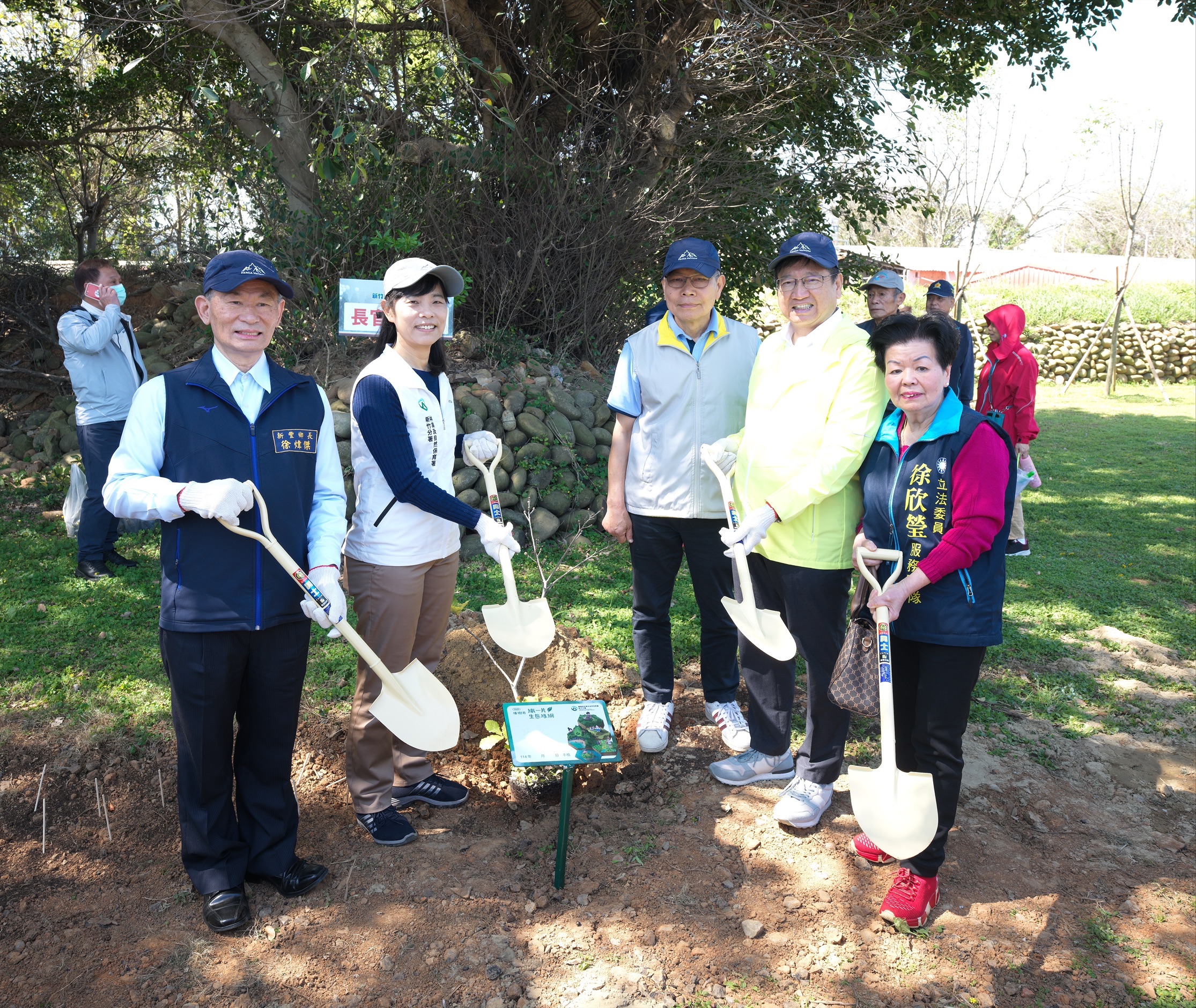 今(22)日林業及自然保育署新竹分署與新竹縣政府合作,於新豐鄉新庄子後營區野戰公園舉辦植樹贈苗活動,響應植樹月共同「織一片生態綠網」,由新竹分署分署長夏榮生、新竹縣長楊文科、新竹縣議會議長張鎮榮、新竹縣新豐鄉長徐煒傑、新竹縣新豐鄉民代表會主席田鼎睿及來自新豐鄉各村里鄉親共同種下槲櫟和厚葉石斑木等臺灣原生植物,營造公園未來樹木成林、花叢盛開的繁盛樣貌,吸引獨角仙、蝴蝶等昆蟲、鳥類居住,打造適合親子同遊同樂的生態公園。