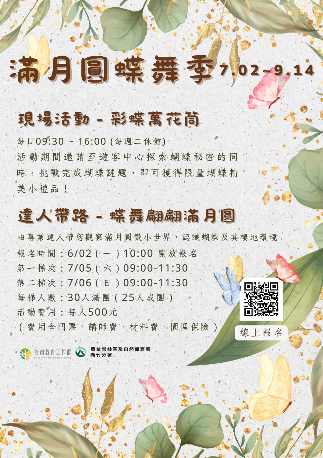 為了讓更多遊客認識滿月圓豐富的蝴蝶生態,遊客中心將於7月2日至9月14日舉辦【滿月圓蝶舞季】活動,活動期間包含兩大主題:「現場活動-彩蝶萬花筒」及預約參加的「達人帶路-蝶舞翩翩滿月圓」。【彩蝶萬花筒】活動中,民眾將認識園區內常見的12種蝴蝶,並可獲得限定的蝴蝶小卡,作為難忘旅程的紀念品;而【達人帶路-蝶舞翩翩滿月圓】則由蝴蝶專家親自導覽,帶領參加者深入認識蝴蝶生態,並體驗摺紙蝴蝶的手作樂趣,該活動採預約報名制,將於7月5日(六)及7月6日(日)舉辦兩梯次,每梯次限額30人,總名額60人,即日起開放線上報名,額滿為止。