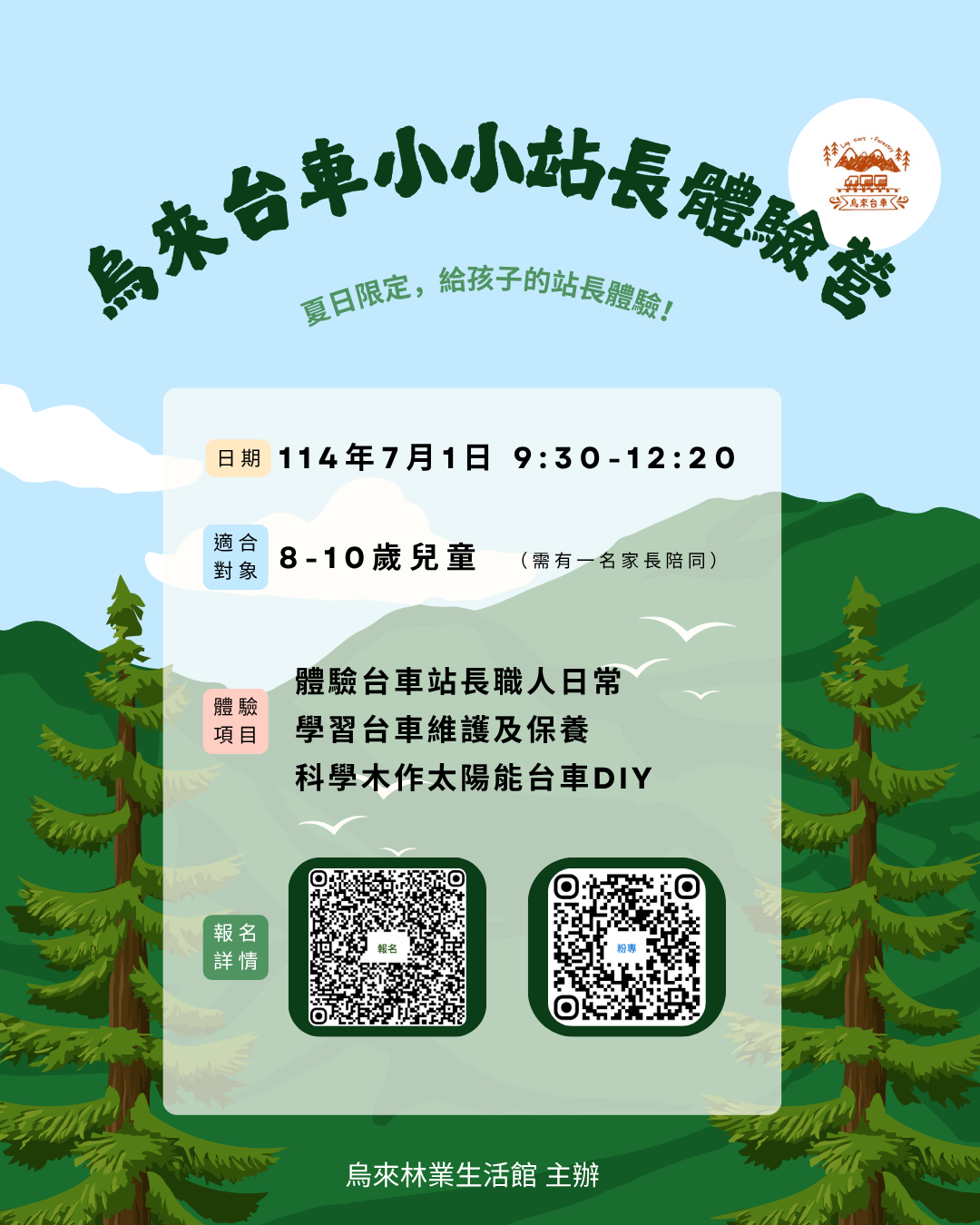 今年暑假,一場結合鐵道文化、職人體驗與科學手作的活動即將登場!林業及自然保育署新竹分署所屬烏來林業生活館將於7月1日(週二)上午9時30分至12時20分辦理「烏來台車小小站長體驗營」,以8至10歲孩童為參加對象,每位參與小朋友需有一位家長全程陪同,活動名額16位,每名報名費1,500元,歡迎全台鐵道迷小朋友前來參與,搶先啟動夏日冒險旅程,歡迎即日起上網報名(https://forms.gle/soeUnXBKWJWLymUN9)參加。 本次體驗營以烏來在地特色的「台車文化」為核心,特別安排烏來台車站長親自教學,帶領孩童了解鐵道文化、車站設施、行車安全與車體維護等幕後秘辛,並且走進神秘的台車保養廠一探究竟,讓孩童認識專業台車軌道知識外,也能了解職人工作的敬業精神與職場態度。 活動內容除了體驗站長與售票員的職人日常與工作任務,解鎖任務能獲得「小小站長學習證書」外,更安排深受孩子喜愛的木作科學DIY課程—太陽能動力台車製作。透過動手操作與創意發想,從「知識」轉化為「實作」,啟發孩子對能源運用的思索,以及提升手作技能與邏輯思考。 每位參與的小朋友,除了體驗搭乘台車山林之旅外,也將獲得一頂台車帽作紀念,並與職人服裝擺拍,留下美好的暑假回憶,歡迎前來體驗台車站長的日常。 相關活動資訊如下: 活動名稱:烏來台車小小站長體驗營 日期時間:114年7月1日(週二),上午9時30分至12時20分 (9時10分至9時30分於烏來台車站集合報到) 地點:烏來台車站及烏來林業生活館。 對象:國小升二年級至升五年級孩童(約8–10歲),每位孩童須有一位家長陪同參與。 費用:1500元/人(含一位家長陪同)。 ● 名額:16位。 ● 報名連結:https://forms.gle/soeUnXBKWJWLymUN9 即日起開放報名,額滿即止!台車即將出發,歡迎上車! 聯絡資訊: FB粉專|烏來林業生活館 (週二固定休館) 地址|新北市烏來區瀑布路75號(烏來林業生活館) Email|wulai.fly@gmail.com