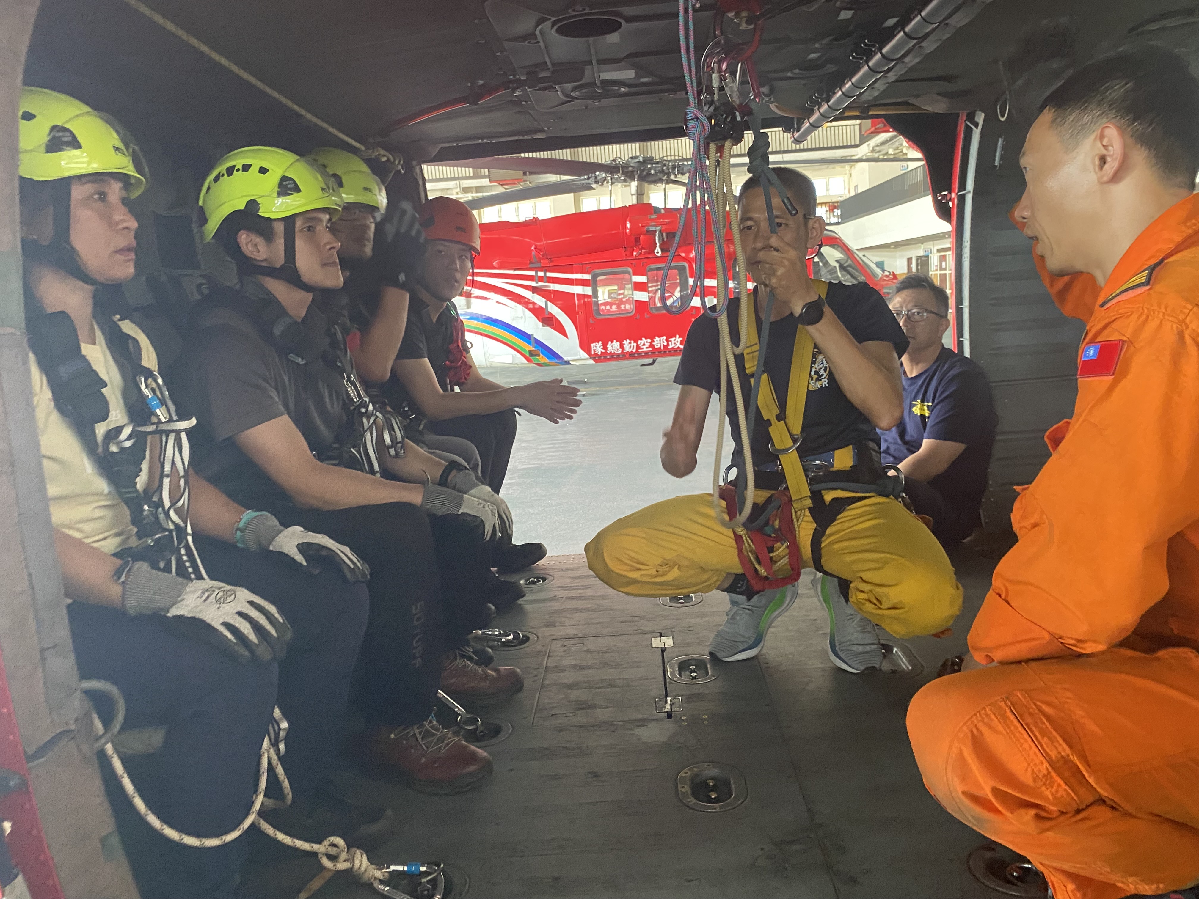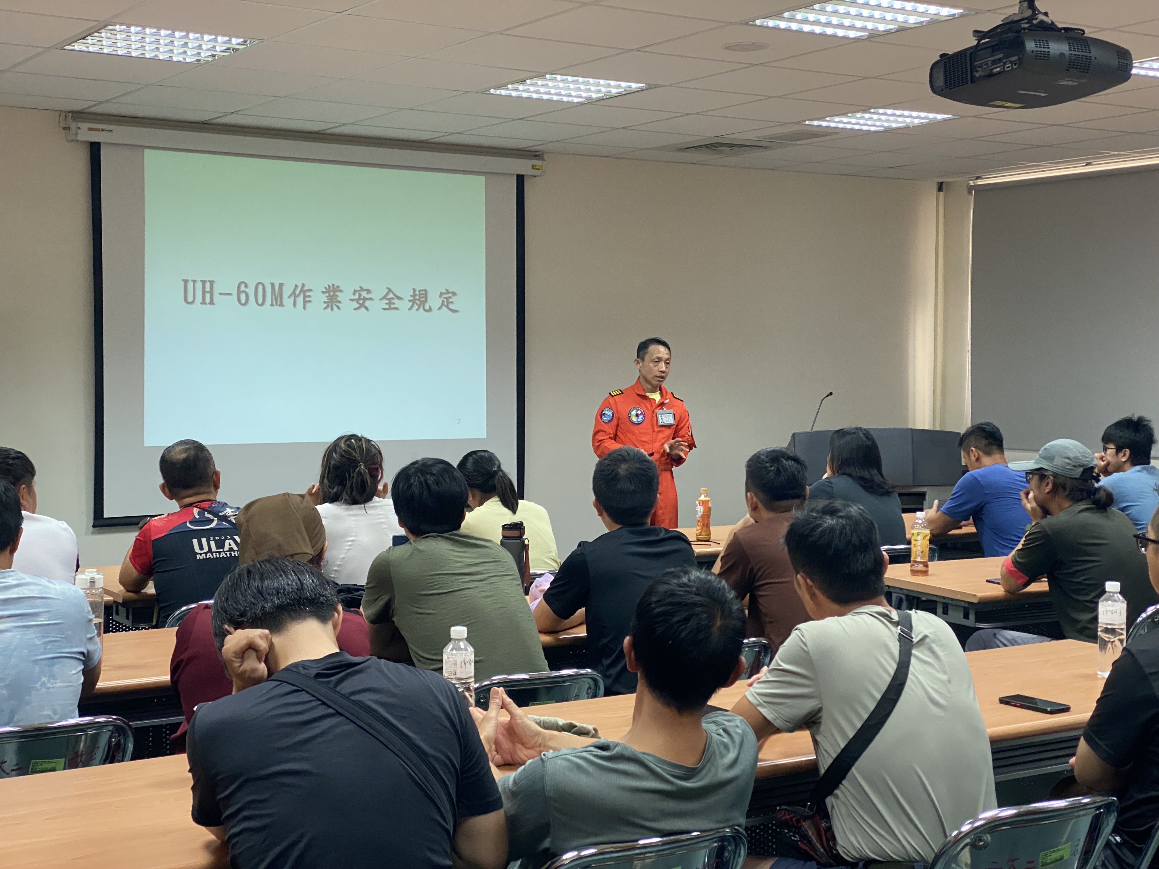 訓練第一日於空中勤務總隊第二大隊駐地進行,共計40位新竹分署所屬森林救火隊菁英參訓,由專業教官講授直升機作業相關知識,課程涵蓋直升機作業性能、安全規範、空中指揮手勢、吊掛裝備操作等學科與靜態實作訓練,讓學員在實機操演前先熟悉各項作業流程,並透過綜合座談與業務交流,深化林務單位與空勤部隊間的協作默契。第二日轉往台中市土牛亞拓飛行場進行實機操演,由黑鷹直升機(UH-60M)支援吊掛演練,參訓隊員分批完成10公尺高空進出機艙吊掛模擬演練,累積寶貴實戰經驗,也鍛鍊應對災害的膽識與技術。