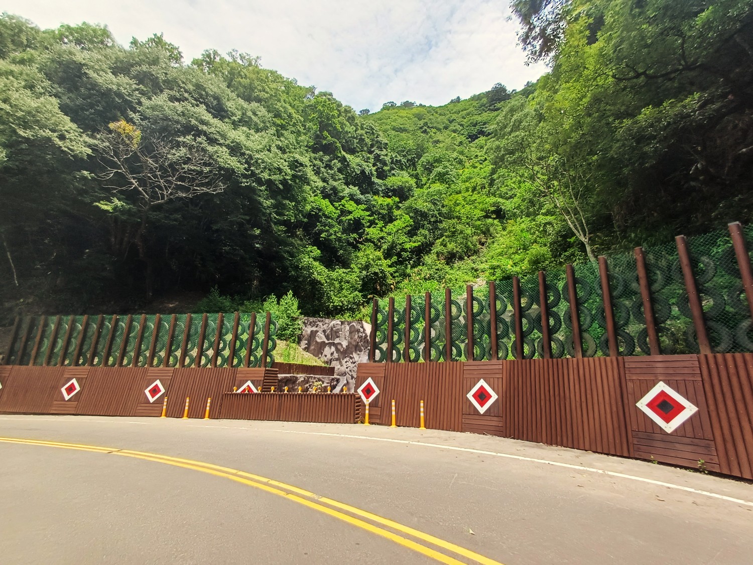 「大溪事業區第153林班坑溝整治工程」則以延壽防災設施為核心,修繕既有擋土牆與防落石網,有效提升設施使用年限與功能,並注重與自然環境的融合。工程外觀採用仿岩設計,搭配國產柳杉製作的半圓木與方塊木美化護欄,結合當地原住民文化元素,展現環境美感與在地特色。為實踐環境永續理念,重複利用廢棄輪胎作為護欄防護材料,並於靜水池設置動物通道,避免野生動物受困,體現生態友善理念。
