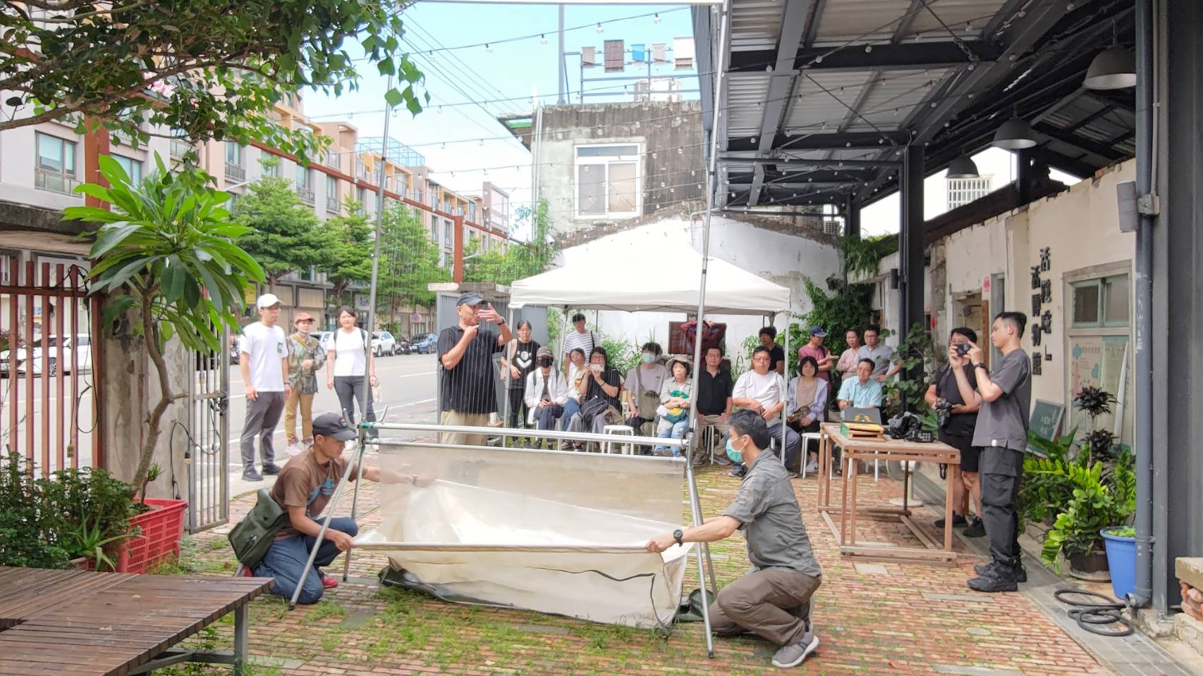 這場研習特別帶領學員們,實地探訪了隱身在新竹城區的「大煙囪」,一個對霜毛蝠來說至關重要的棲息地。臺灣是霜毛蝠棲息分布的最南界,過去的紀錄都只零星出現個體。然而,2010年,在大煙囪內部廢棄煙囪的夾縫處,首次發現了霜毛蝠的群集紀錄,這也是國內首次發現霜毛蝠的生殖育幼棲所,這項發現奠定了「大煙囪」重要的生態地位,也凸顯了保育的急迫性。研習過程中,講師們不僅在現場示範了豎琴網的架設與操作,也詳盡解說了蝙蝠巢箱的設計與用途。最後,更引導學員們實地觀察並判讀蝙蝠棲所的特徵,透過這些親身實踐,深化了學員們的實務經驗。