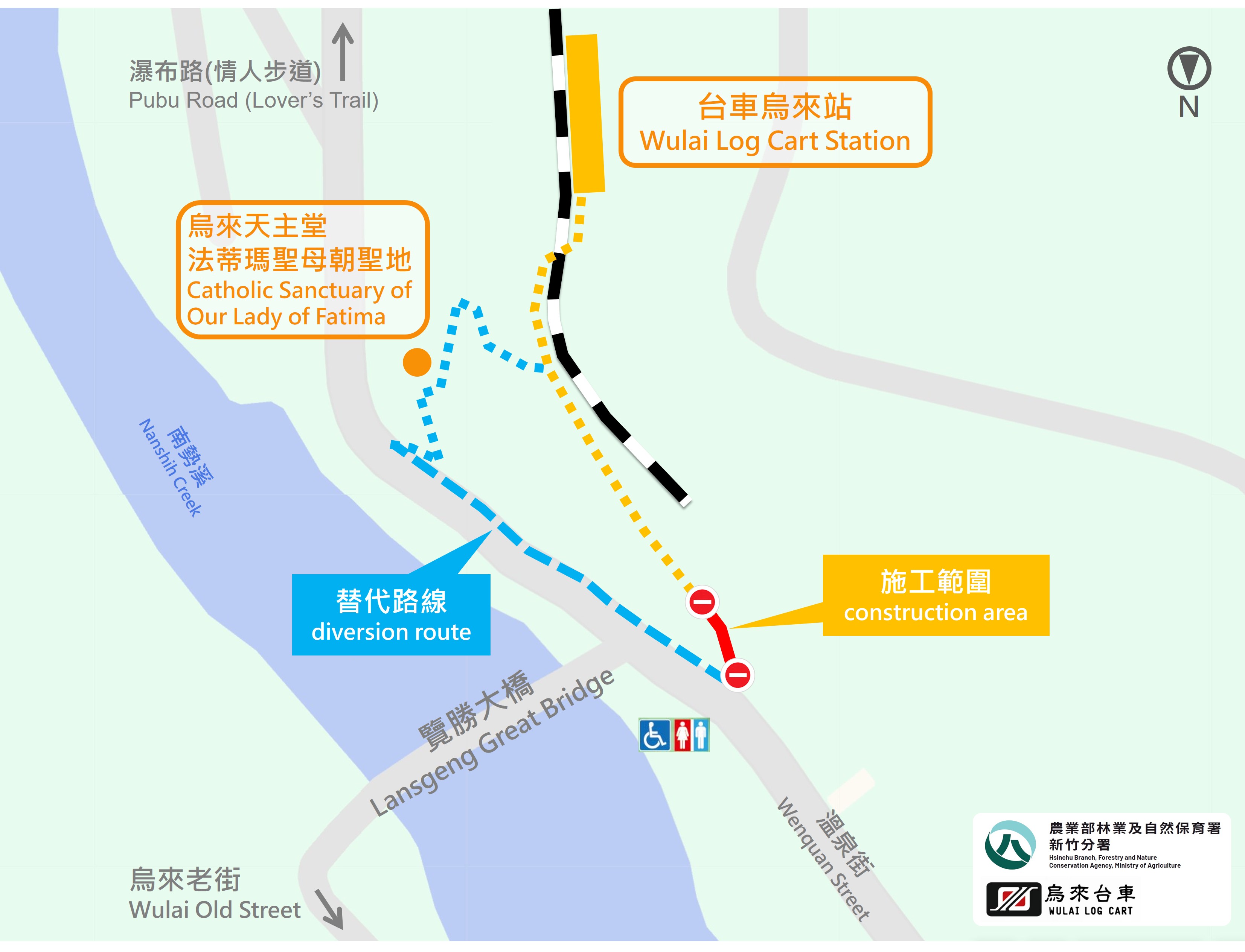 烏來台車站位於新北市烏來地區,是遊客體驗烏來之美的重要起點。林業及自然保育署新竹分署為營造嶄新入口意象,並提升遊客通行安全,辦理台車站牌面更新及入口階梯改善工程。工程需要將延長至9月30日恢復通行。施工期間請遊客依循現場指引,暫時改由烏來天主堂法蒂瑪聖母朝聖地階梯前往烏來台車站,造成不便敬請見諒。