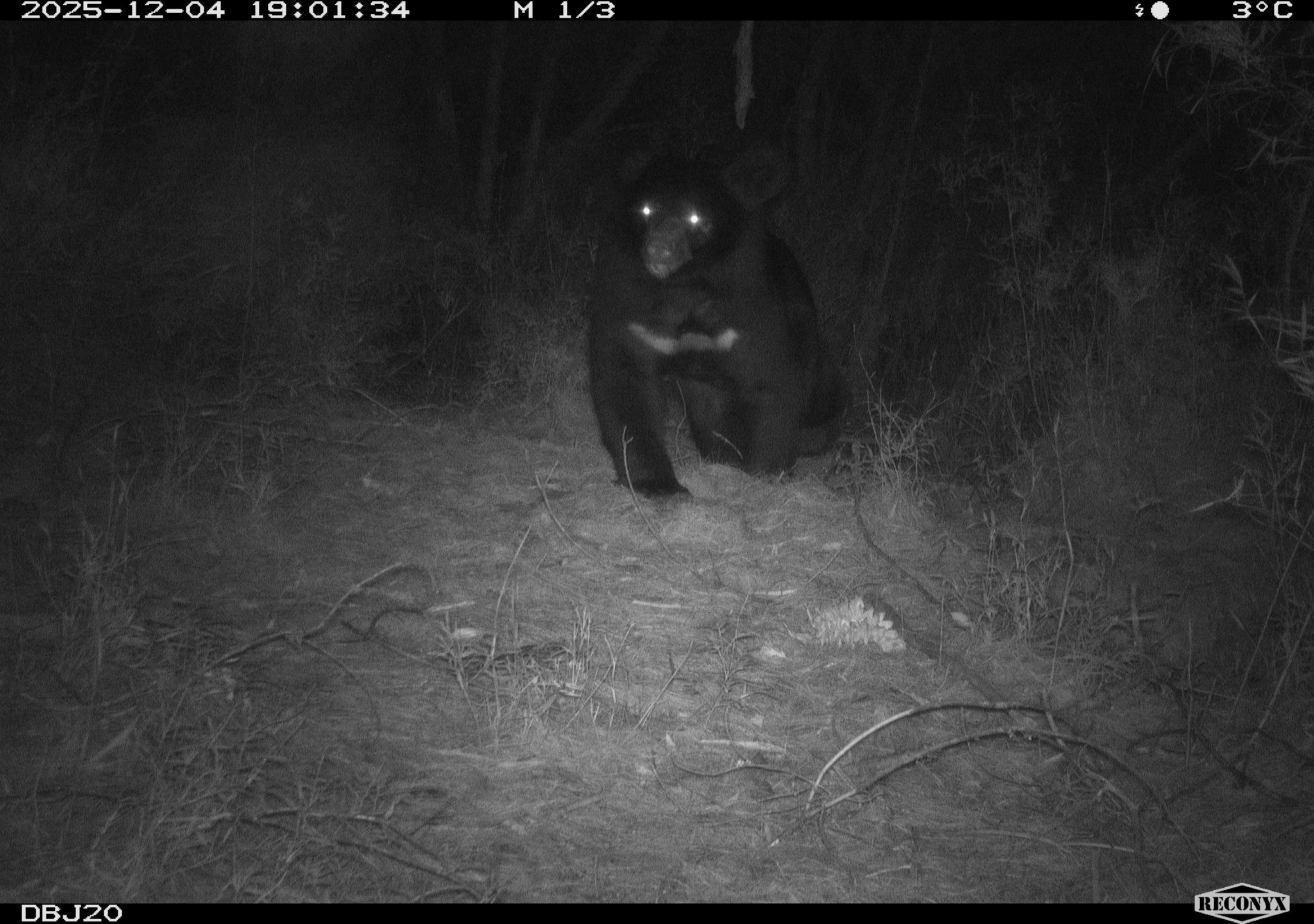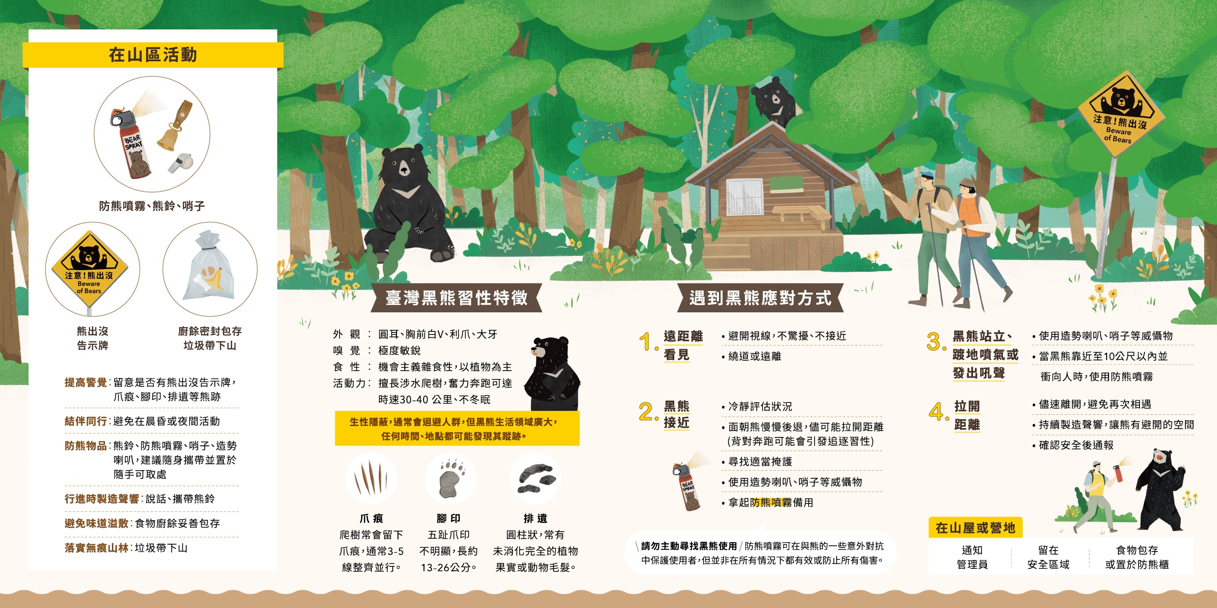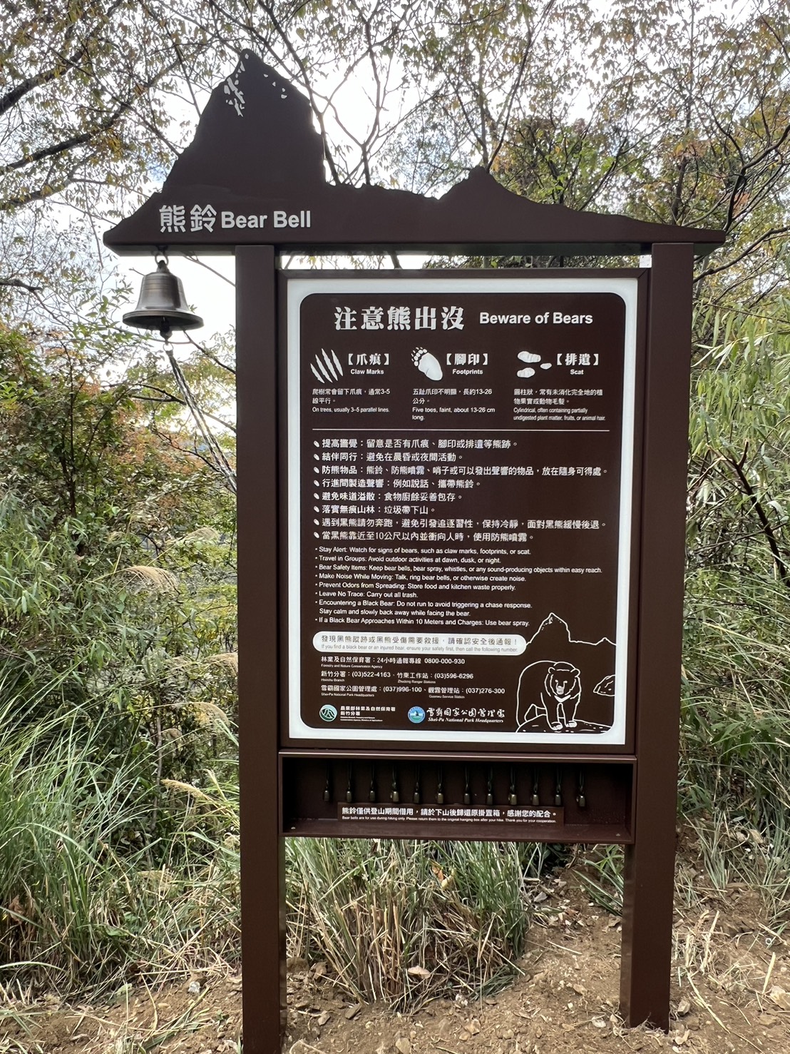 春節連續假期將至,預期入山活動人潮增加。林業及自然保育署新竹分署表示,近期於九九山莊與霞喀羅國家步道周邊發現臺灣黑熊蹤跡,提醒入山遊客活動時提高警覺,做好防範措施,降低人熊遭遇風險。 為監測臺灣黑熊族群潛在分布情形,新竹分署委託野聲環境生態有限公司,於大鹿林道東線至九九山莊周邊架設15台紅外線自動照相機。近期團隊檢視影像資料發現,最靠近山莊的3台相機中,有2台分別於114年11月及12月晚間7時左右拍攝到臺灣黑熊影像。其中1台相機距九九山莊僅約160公尺,初步判定為同一隻個體。 為強化登山安全,新竹分署在大鹿林道東線15K休息點與19K馬達拉溪登山口各設置1座「注意熊出沒」告示牌,提醒山友提高警覺;告示牌下方設熊鈴掛置箱,提供山友上攀大小霸前借用,下山後原處歸還即可;佩帶熊鈴可讓山友在行進間製造聲響,以降低遭遇臺灣黑熊的可能性。 九九山莊海拔高度2,699公尺,為山友攀登大霸尖山前重要休憩據點,由多棟山屋組成並持續整建中。山屋提供炊煮場域,山友可自備簡易炊煮用具或洽詢高山協作團體。為預防人熊衝突,九九山莊工作人員於山友入住時,均加強對山友宣導人熊相遇的應變措施;同時儘量集中安排住宿房間,並要求自行炊煮的山友及協作團體妥善管理食物及廚餘,避免氣味誘引臺灣黑熊靠近。後續規劃於九九山莊周邊架設AI即時預警系統,未來拍攝到黑熊即發出預警通知,以降低衝突發生的可能性。 此外,在霞喀羅國家步道也有發現臺灣黑熊痕跡。新竹分署持續與山區部落合作成立黑熊巡守隊,霞喀羅國家步道尖石段是養老部落黑熊巡守隊的巡查路線。114年12月,野聲團隊偕同巡守隊成員巡查並更換相機的記憶卡、電池時,在距白石駐在所約600公尺的相機旁樹上發現新的黑熊爪痕。 霞喀羅國家步道沿途景觀豐富,入秋時可見滿山火紅的楓樹林,是知名的賞楓景點。新竹分署提醒,登山建議結伴同行,並攜帶熊鈴、防熊噴霧或可發出聲響的器具,置於隨手可得處。黑熊嗅覺靈敏,登山期間應妥善包存食物與廚餘,切勿隨意棄置。若在山區遇到黑熊,應保持冷靜與安全距離,避免靠近或追逐拍照。若發現黑熊入侵或遭誤捕受困等情事,請在確認自身安全後,通報新竹分署或林業保育署免付費專線0800-000-930(您您您救山林)。 為便利民眾快速了解遇到臺灣黑熊的正確應對方式,林業及自然保育署-自然保育網「山區遭遇野生動物正確因應專區」中設置「在山上遇到熊怎麼辦」專頁(https://conservation.forest.gov.tw/0002326),提供新竹分署製作「黑熊山林相見指南」摺頁,歡迎線上瀏覽,或向新竹分署及轄下工作站及育樂場域索取。